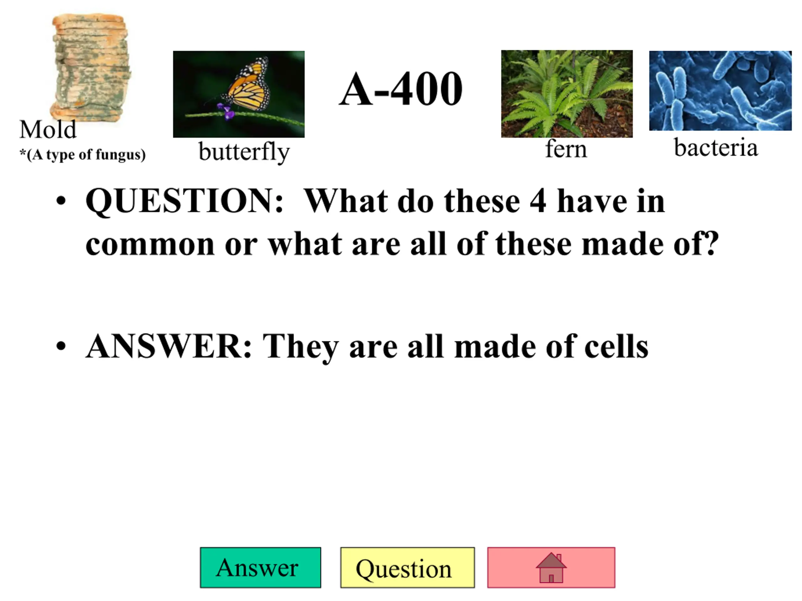A-400 Mold *(A type of fungus) bacteria fern butterfly QUESTION: What do these 4 have in common or what are all of these made of? ANSWER: They are all made of cells Answer Question