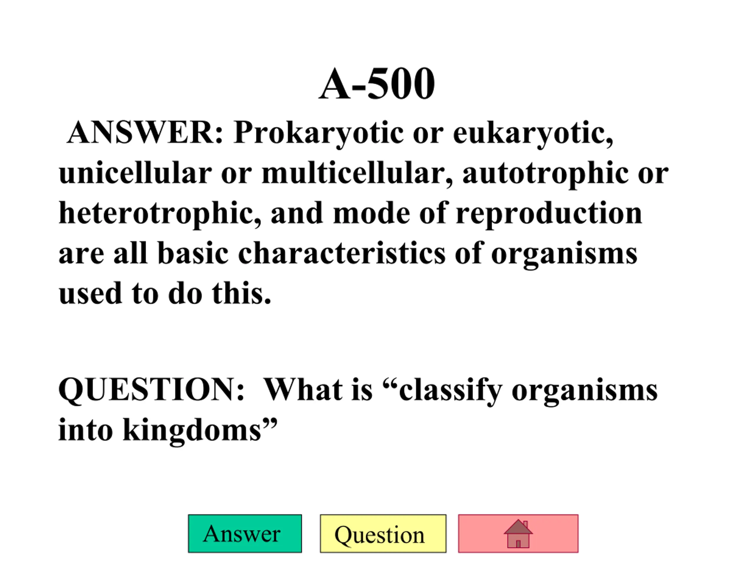 A-500 ANSWER: Prokaryotic or eukaryotic, unicellular or multicellular, autotrophic or heterotrophic, and mode of reproduction are all basic characteristics of organisms used to do this. QUESTION: What is classify organisms into kingdoms Answer Question