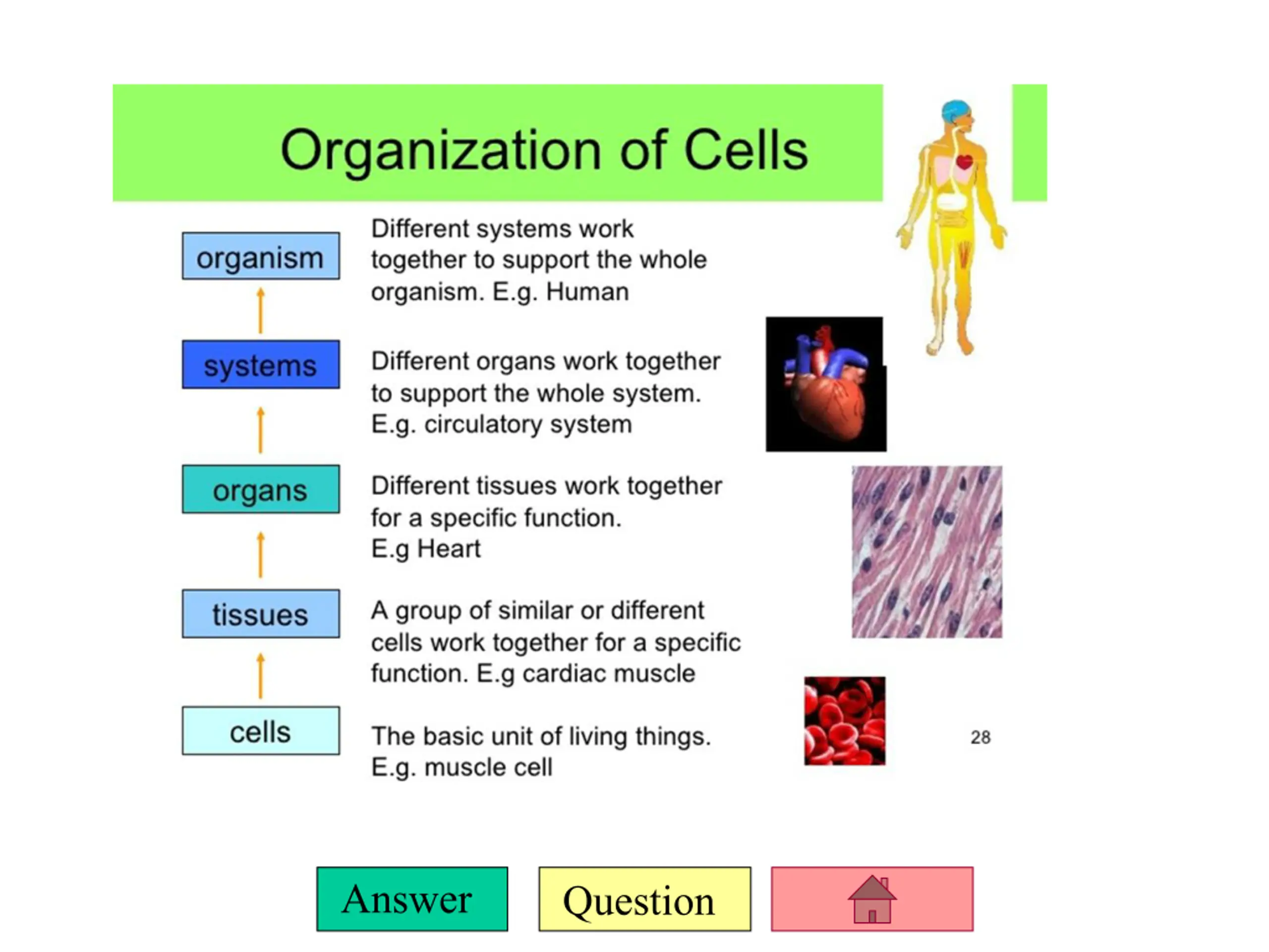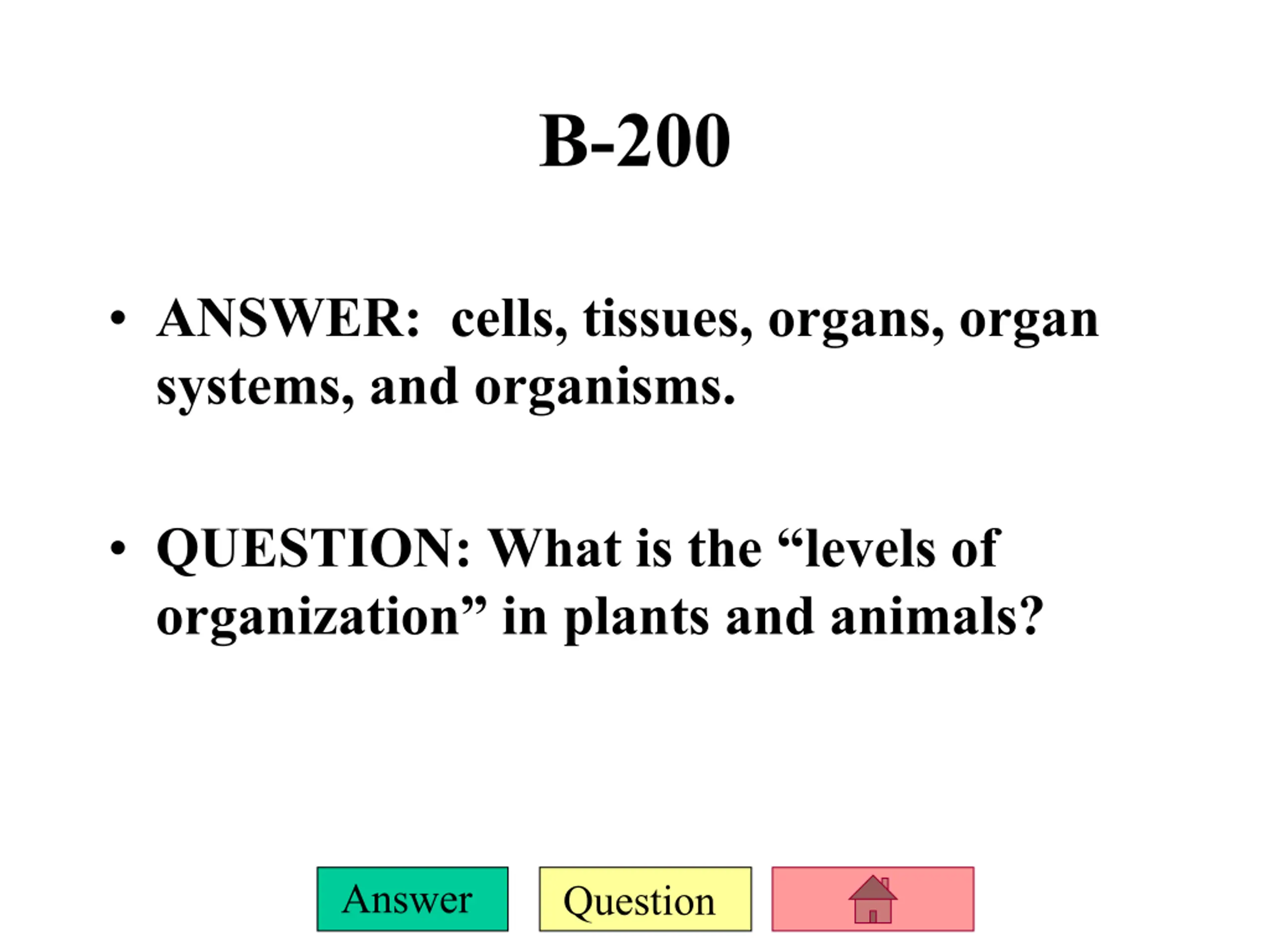 B-200 ANSWER: cells, tissues, organs, organ systems, and organisms. QUESTION: What is the levels of organization in plants and animals? Answer Question