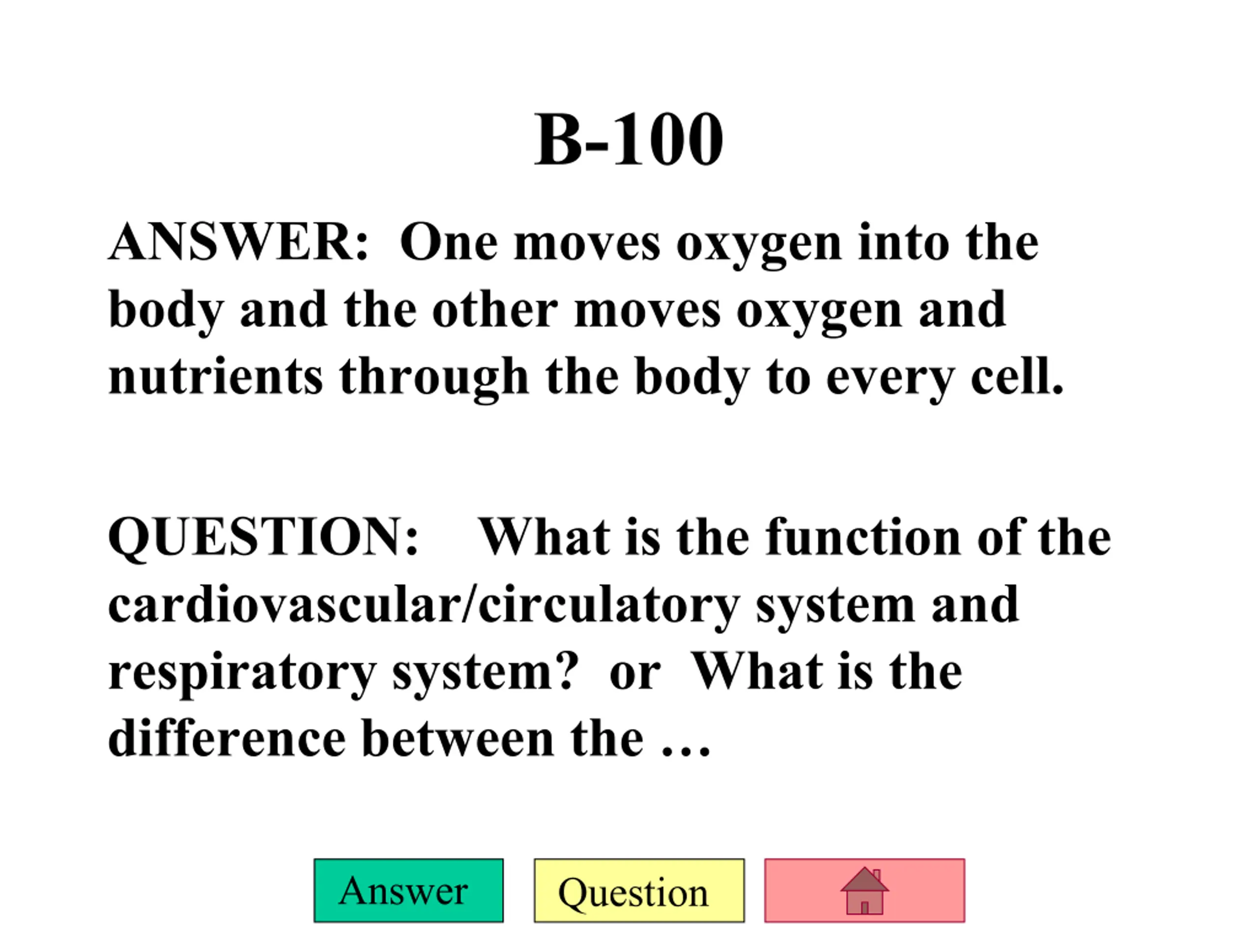 B-100 ANSWER: One moves oxygen into the body and the other moves oxygen and nutrients through the body to every cell. QUESTION: What is the function of the cardiovascular/circulatory system and respiratory system? or What is the difference between the Answer Question