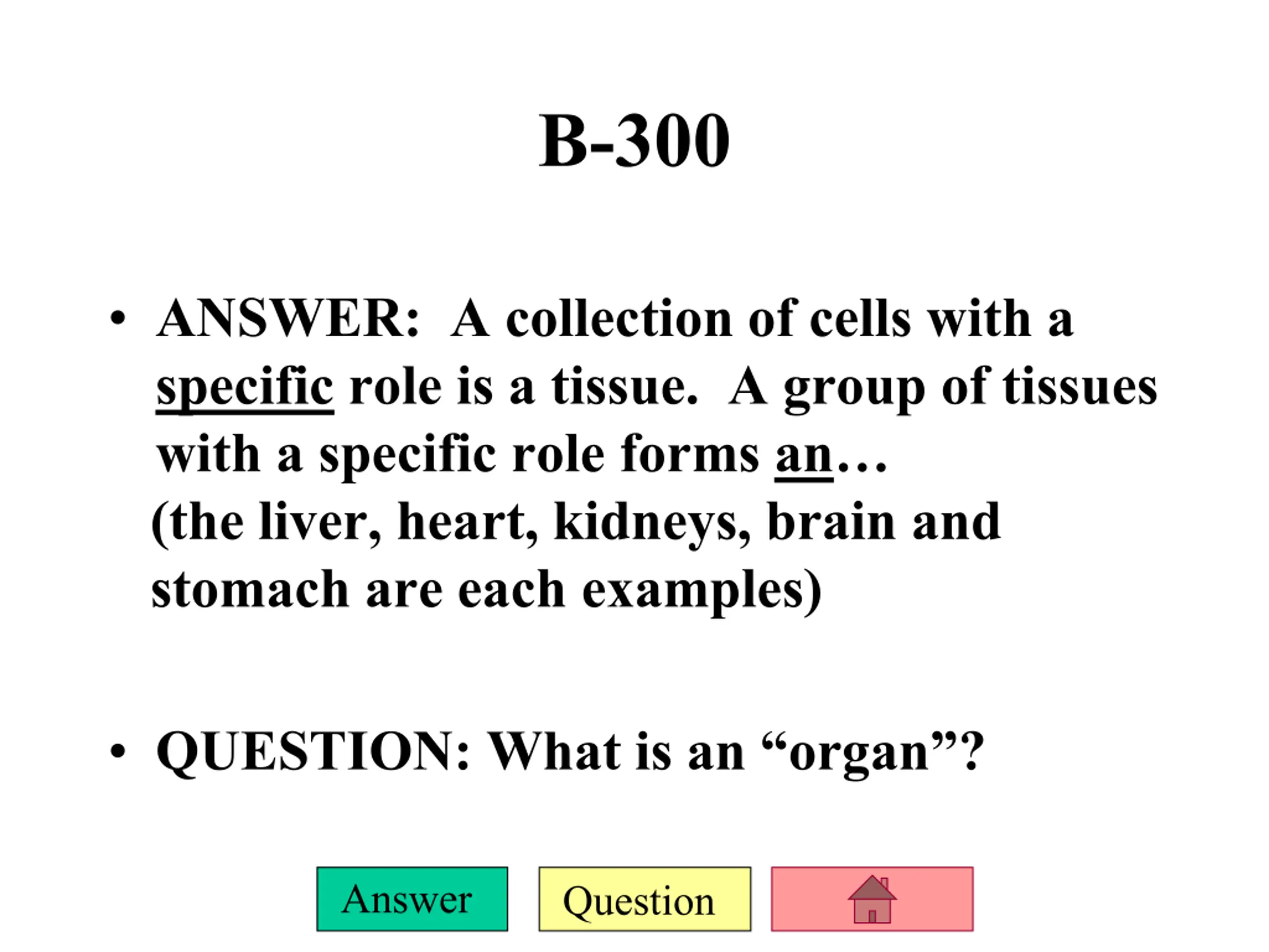 B-300 ANSWER: A collection of cells with a specific role is a tissue. A group of tissues with a specific role forms an (the liver, heart, kidneys, brain and stomach are each examples) QUESTION: What is an organ ? Answer Question