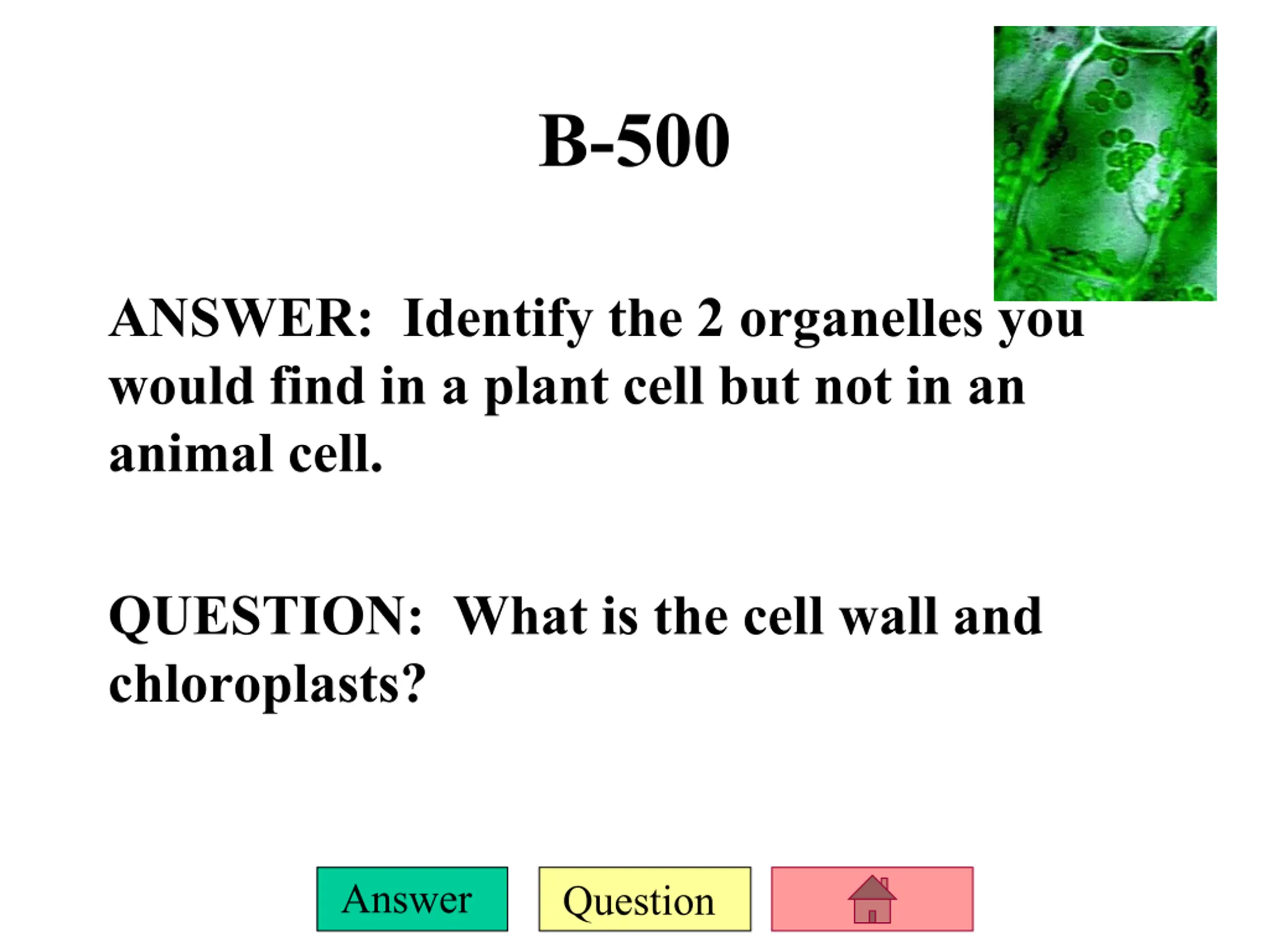 B-500 ANSWER: Identify the 2 organelles you would find in a plant cell but not in an animal cell. QUESTION: What is the cell wall and chloroplasts? Answer Question