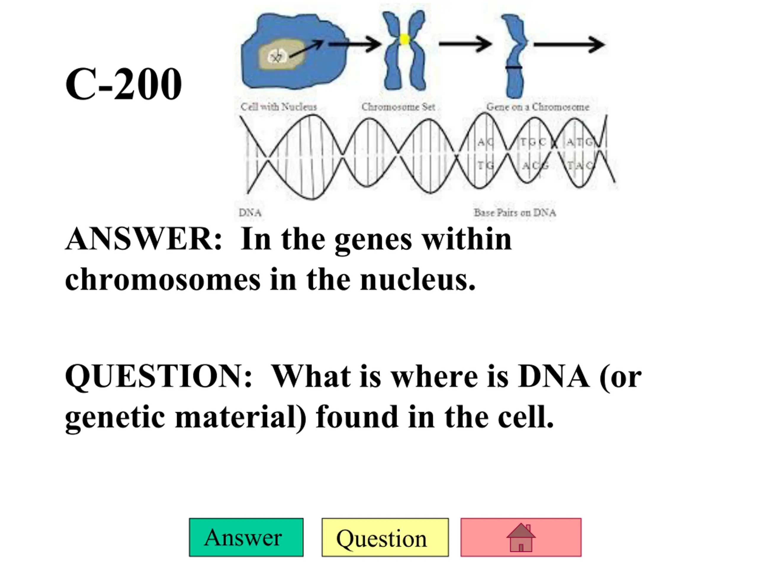 C-200 ANSWER: In the genes within chromosomes in the nucleus. QUESTION: What is where is DNA (or genetic material) found in the cell. Answer Question