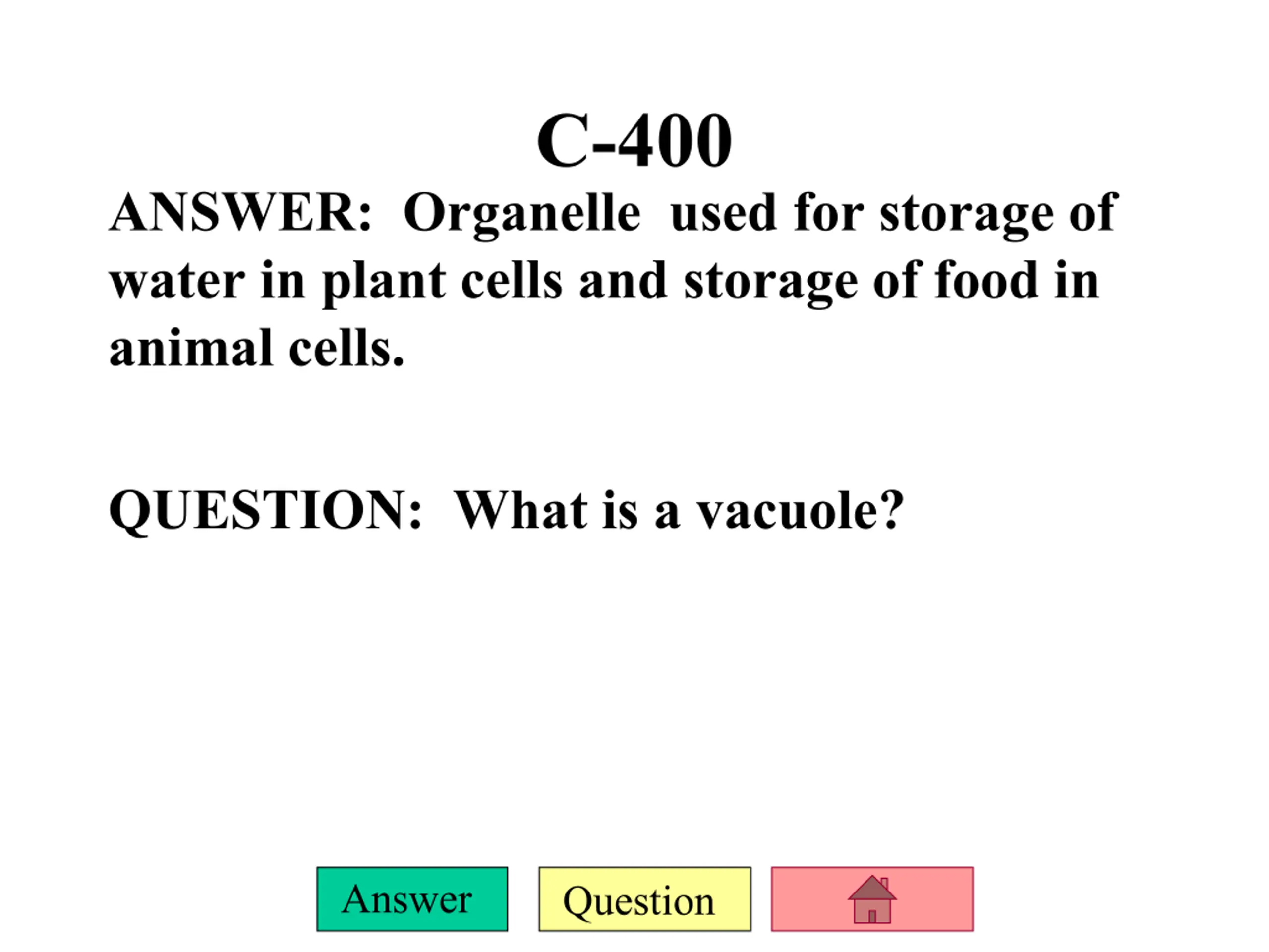 C-400 ANSWER: Organelle used for storage of water in plant cells and storage of food in animal cells. QUESTION: What is a vacuole? Answer Question