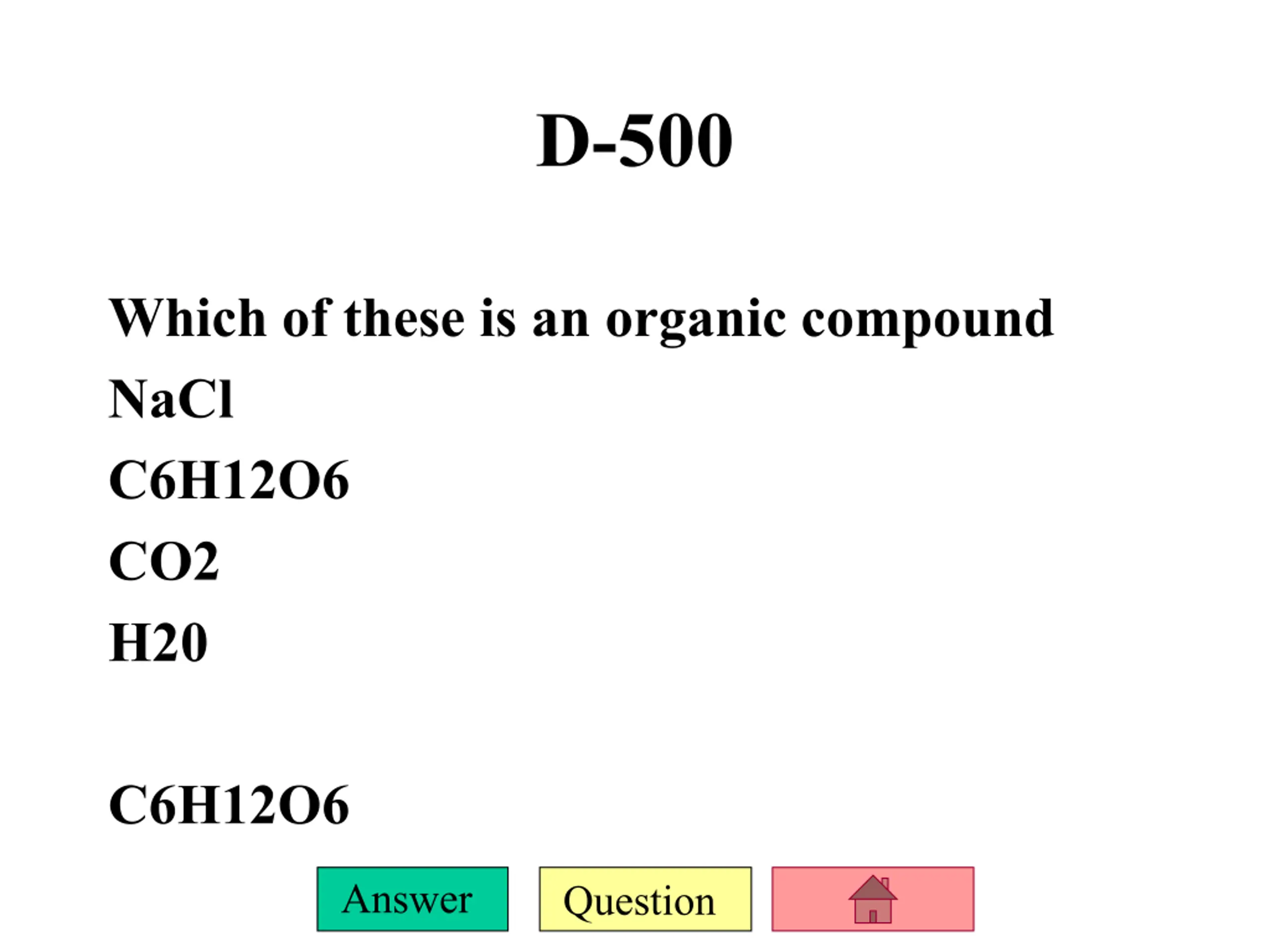 D-500 Which of these is an organic compound NaCl C6H12O6 CO2 H20 C6H12O6 Answer Question
