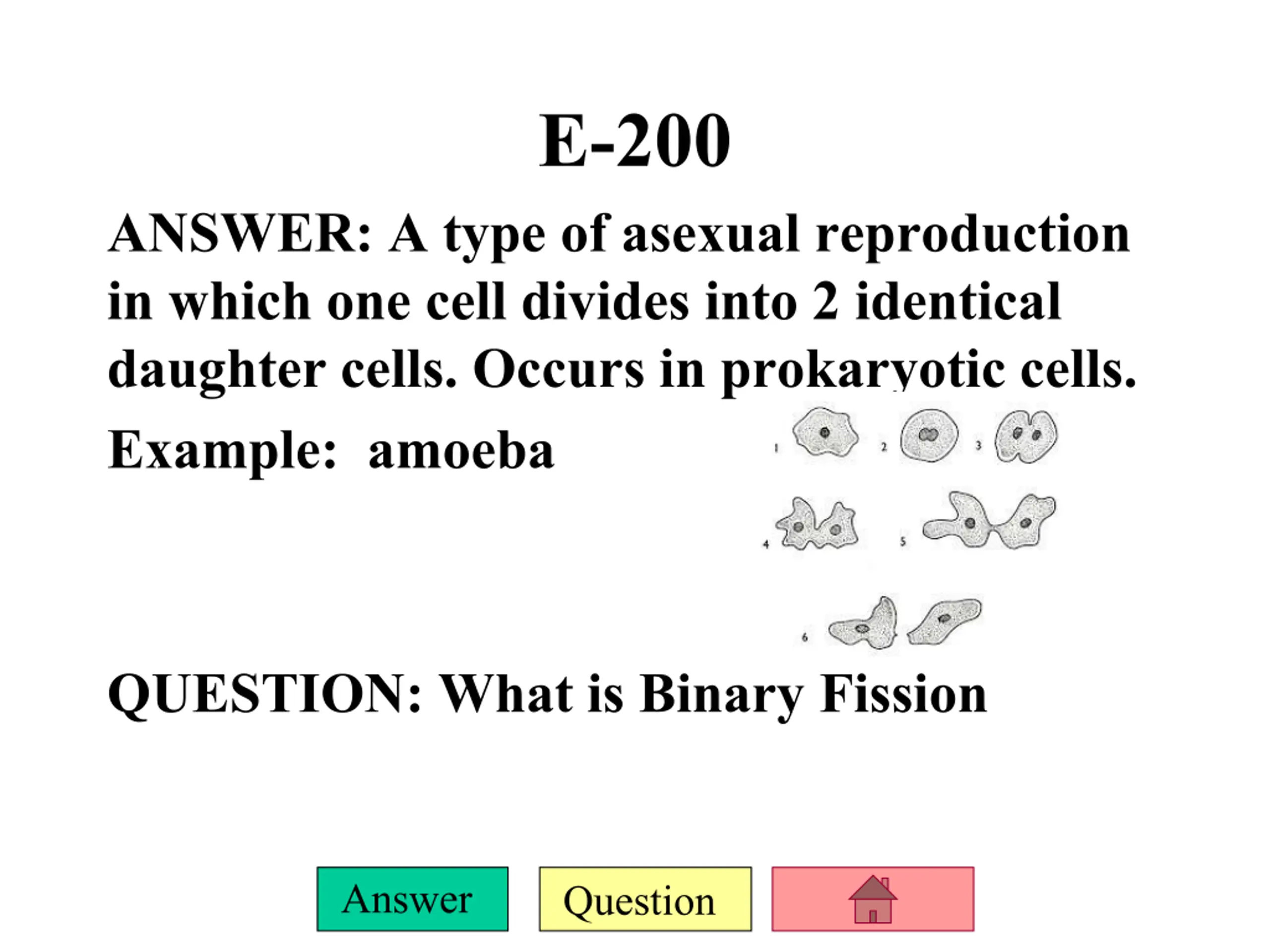 E-200 ANSWER: A type of asexual reproduction in which one cell divides into 2 identical daughter cells. Occurs in prokaryotic cells. Example: amoeba QUESTION: What is Binary Fission Answer Question
