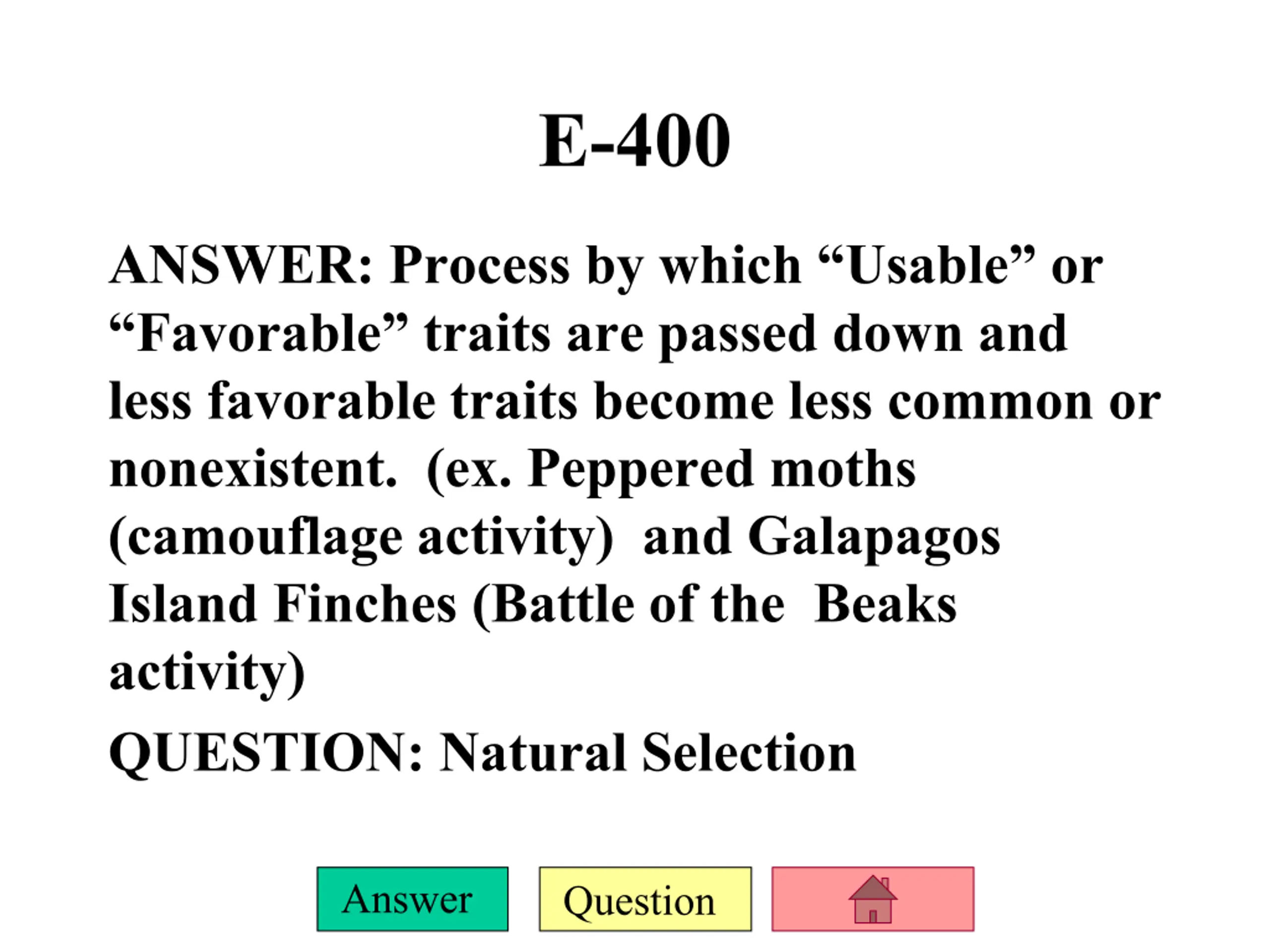 E-400 ANSWER: Process by which Usable or Favorable traits are passed down and less favorable traits become less common or nonexistent. (ex. Peppered moths (camouflage activity) and Galapagos Island Finches (Battle of the Beaks activity) QUESTION: Natural Selection Answer Question