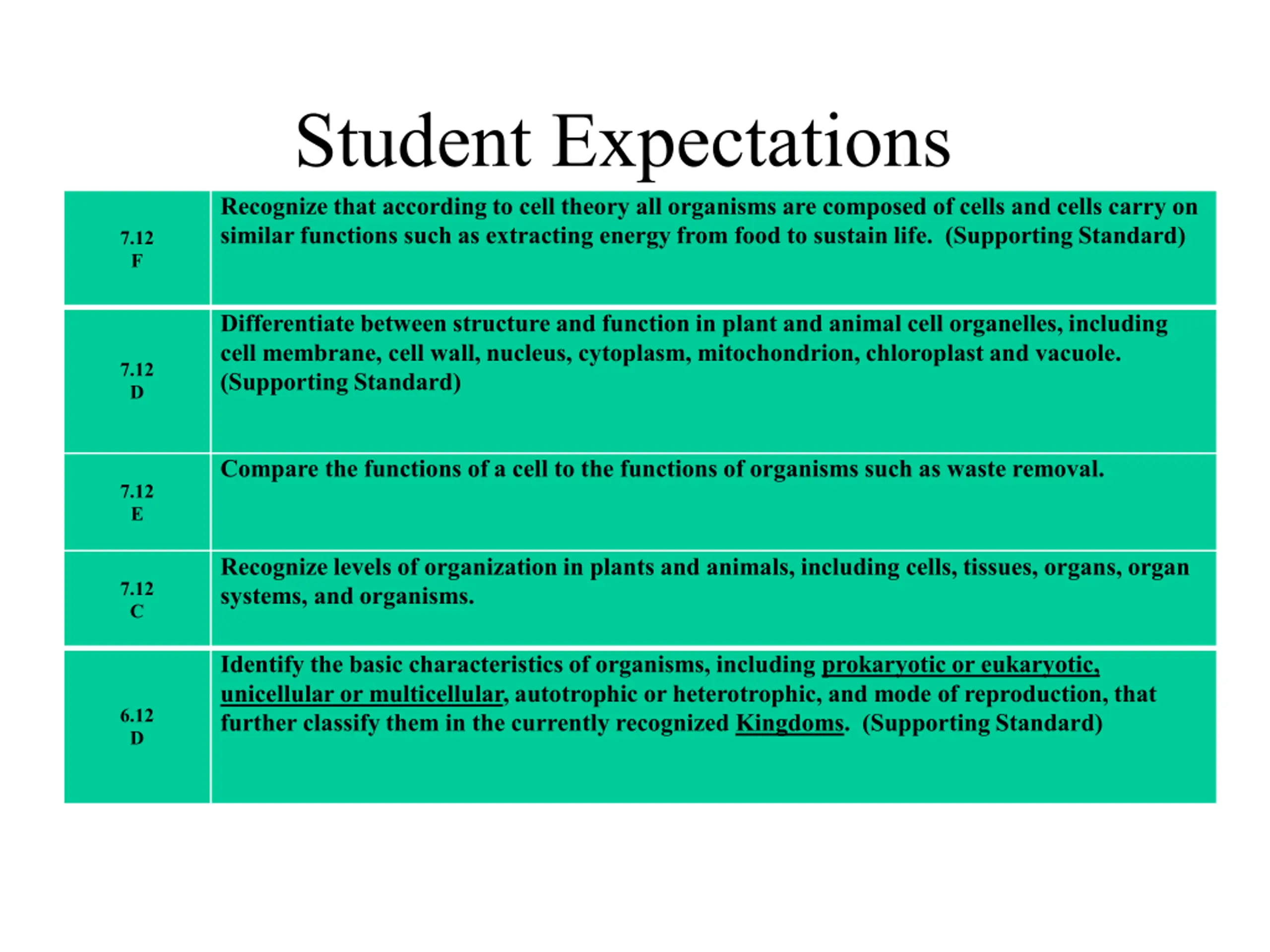 Student Expectations Recognize that according to cell theory all organisms are composed of cells and cells carry on similar functions such as extracting energy from food to sustain life. (Supporting Standard) 7.12 F Differentiate between structure and function in plant and animal cell organelles, including cell membrane, cell wall, nucleus, cytoplasm, mitochondrion, chloroplast and vacuole. (Supporting Standard) 7.12 D Compare the functions of a cell to the functions of organisms such as waste removal. 7.12 E Recognize levels of organization in plants and animals, including cells, tissues, organs, organ systems, and organisms. 7.12 C Identify the basic characteristics of organisms, including prokaryotic or eukaryotic, unicellular or multicellular, autotrophic or heterotrophic, and mode of reproduction, that further classify them in the currently recognized Kingdoms. (Supporting Standard) 6.12 D