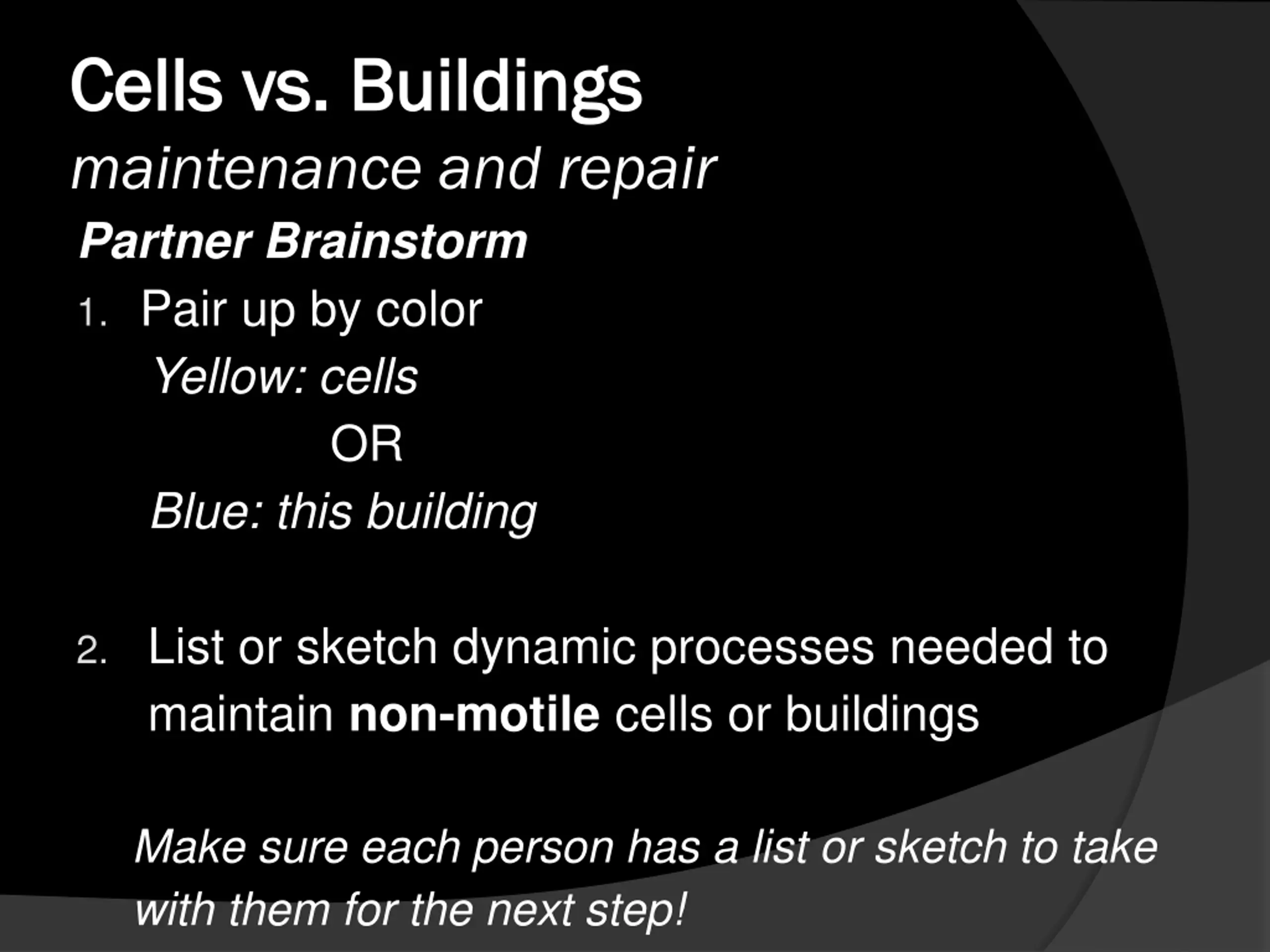 Cells vs. Buildings Cells vs. Buildings maintenance and repair Partner Brainstorm 1. Pair up by color Yellow: cells OR Blue: this building 2. List or sketch dynamic processes needed to maintain non-motile cells or buildings Make sure each person has a list or sketch to take with them for the next step!