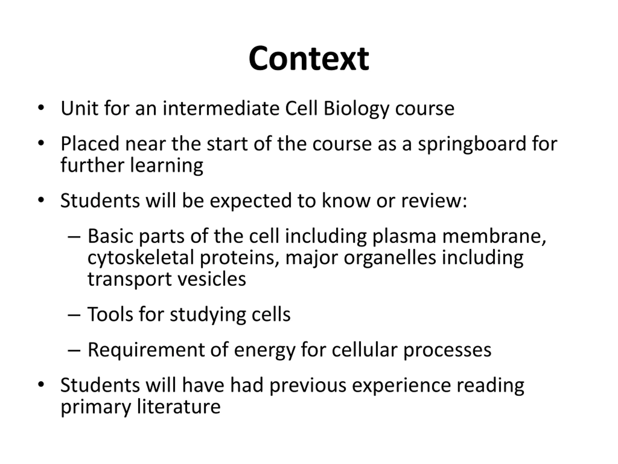 Context Unit for an intermediate Cell Biology course Placed near the start of the course as a springboard for further learning Students will be expected to know or review: Basic parts of the cell including plasma membrane, cytoskeletal proteins, major organelles including transport vesicles Tools for studying cells Requirement of energy for cellular processes Students will have had previous experience reading primary literature