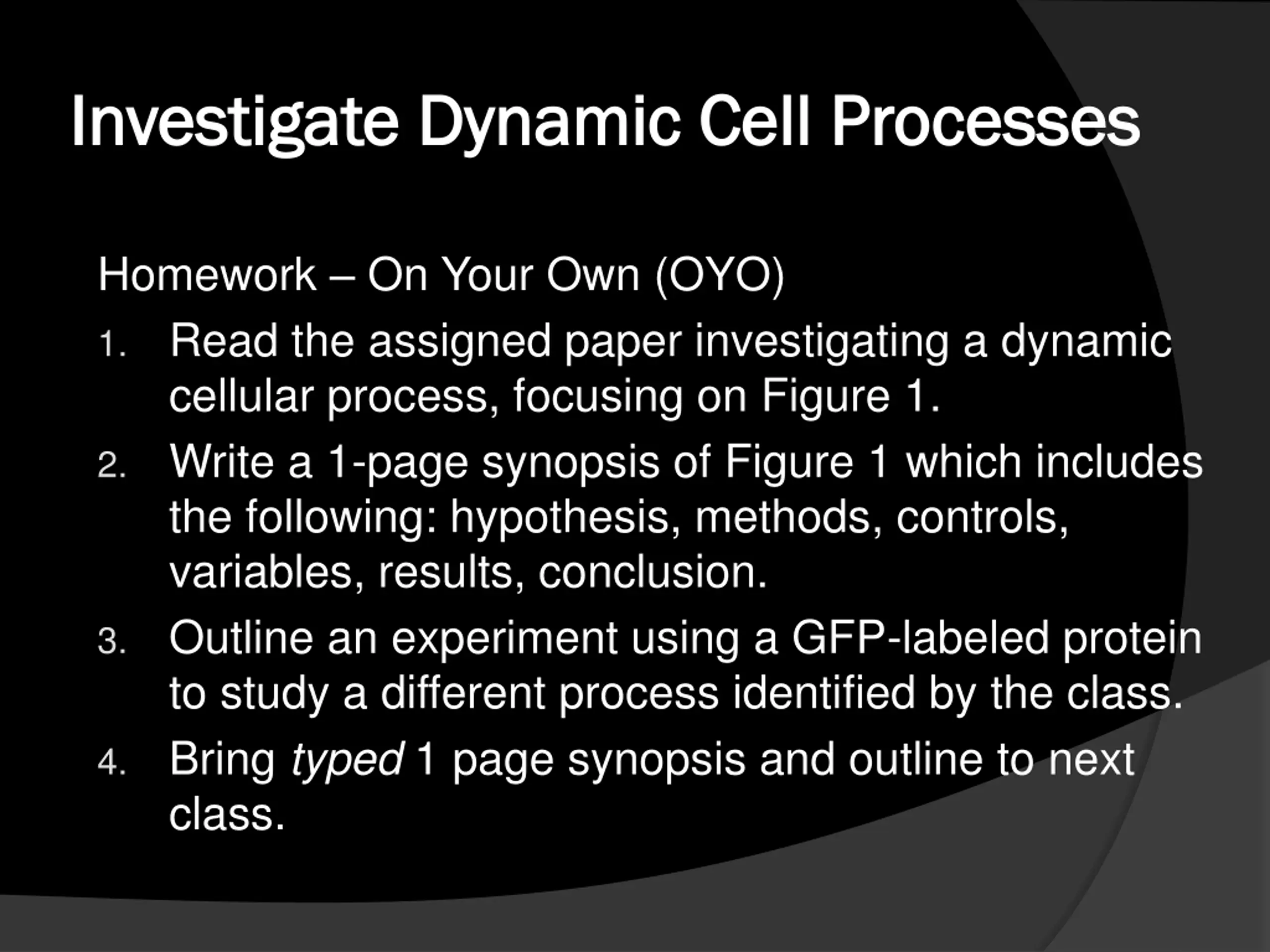 Investigate Dynamic Cell Processes Investigate Dynamic Cell Processes Homework On Your Own (OYO) 1. Read the assigned paper investigating a dynamic cellular process, focusing on Figure 1. 2. Write a 1-page synopsis of Figure 1 which includes the following: hypothesis, methods, controls, variables, results, conclusion. 3. Outline an experiment using a GFP-labeled protein to study a different process identified by the class. 4. Bring typed 1 page synopsis and outline to next class.