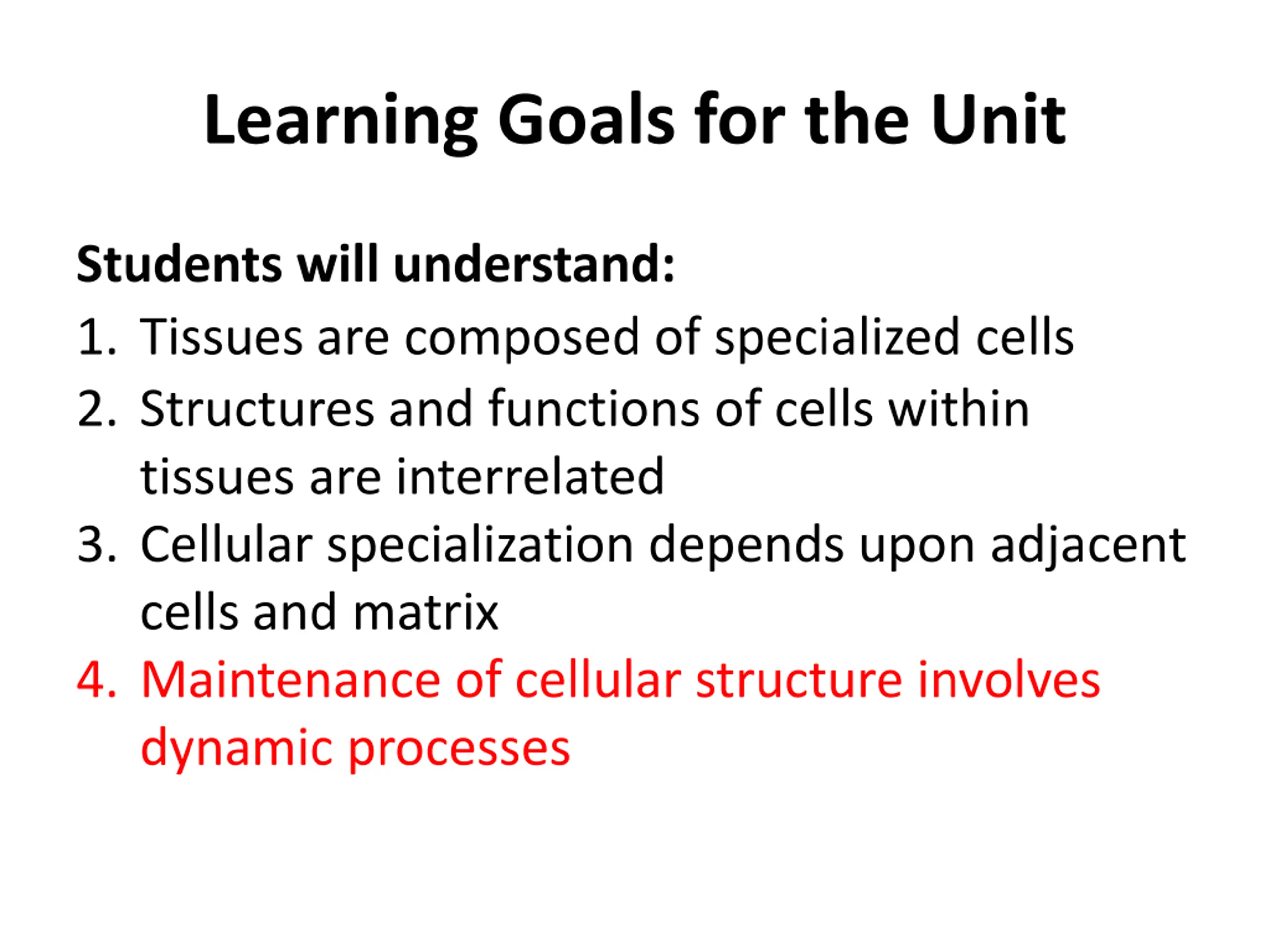 Learning Goals for the Unit Students will understand: 1. Tissues are composed of specialized cells 2. Structures and functions of cells within tissues are interrelated 3. Cellular specialization depends upon adjacent cells and matrix 4. Maintenance of cellular structure involves dynamic processes