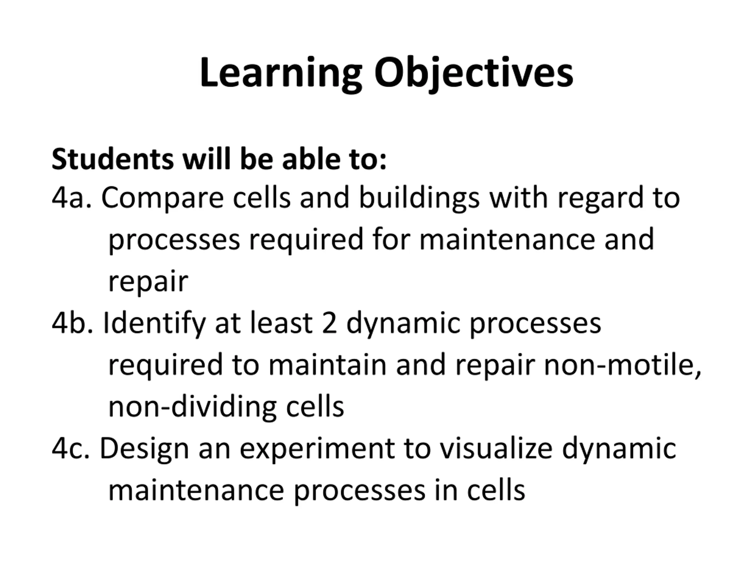Learning Objectives Students will be able to: 4a. Compare cells and buildings with regard to processes required for maintenance and repair 4b. Identify at least 2 dynamic processes required to maintain and repair non-motile, non-dividing cells 4c. Design an experiment to visualize dynamic maintenance processes in cells