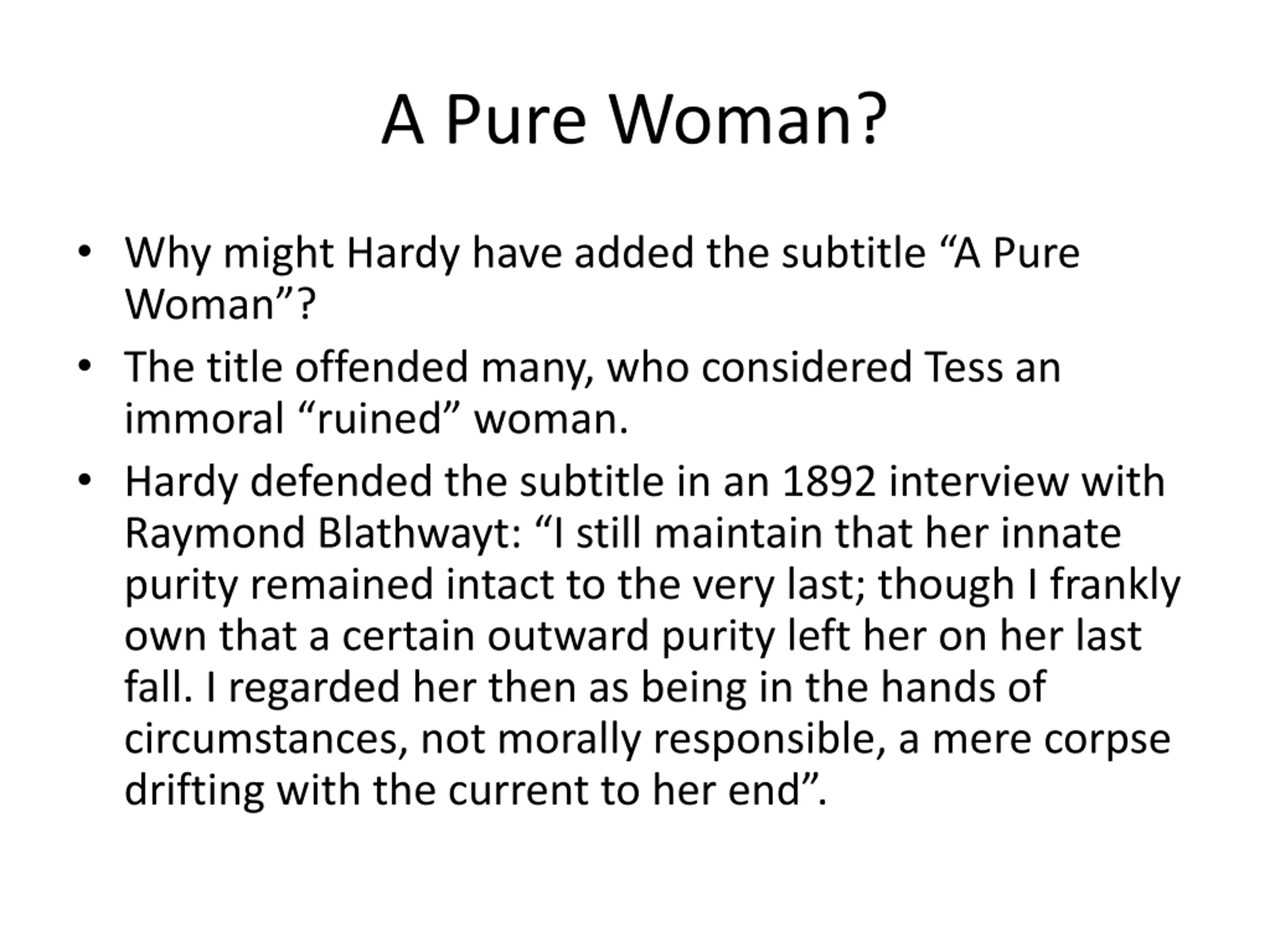 A Pure Woman? Why might Hardy have added the subtitle A Pure Woman ? The title offended many, who considered Tess an immoral ruined woman. Hardy defended the subtitle in an 1892 interview with Raymond Blathwayt: I still maintain that her innate purity remained intact to the very last; though I frankly own that a certain outward purity left her on her last fall. I regarded her then as being in the hands of circumstances, not morally responsible, a mere corpse drifting with the current to her end .