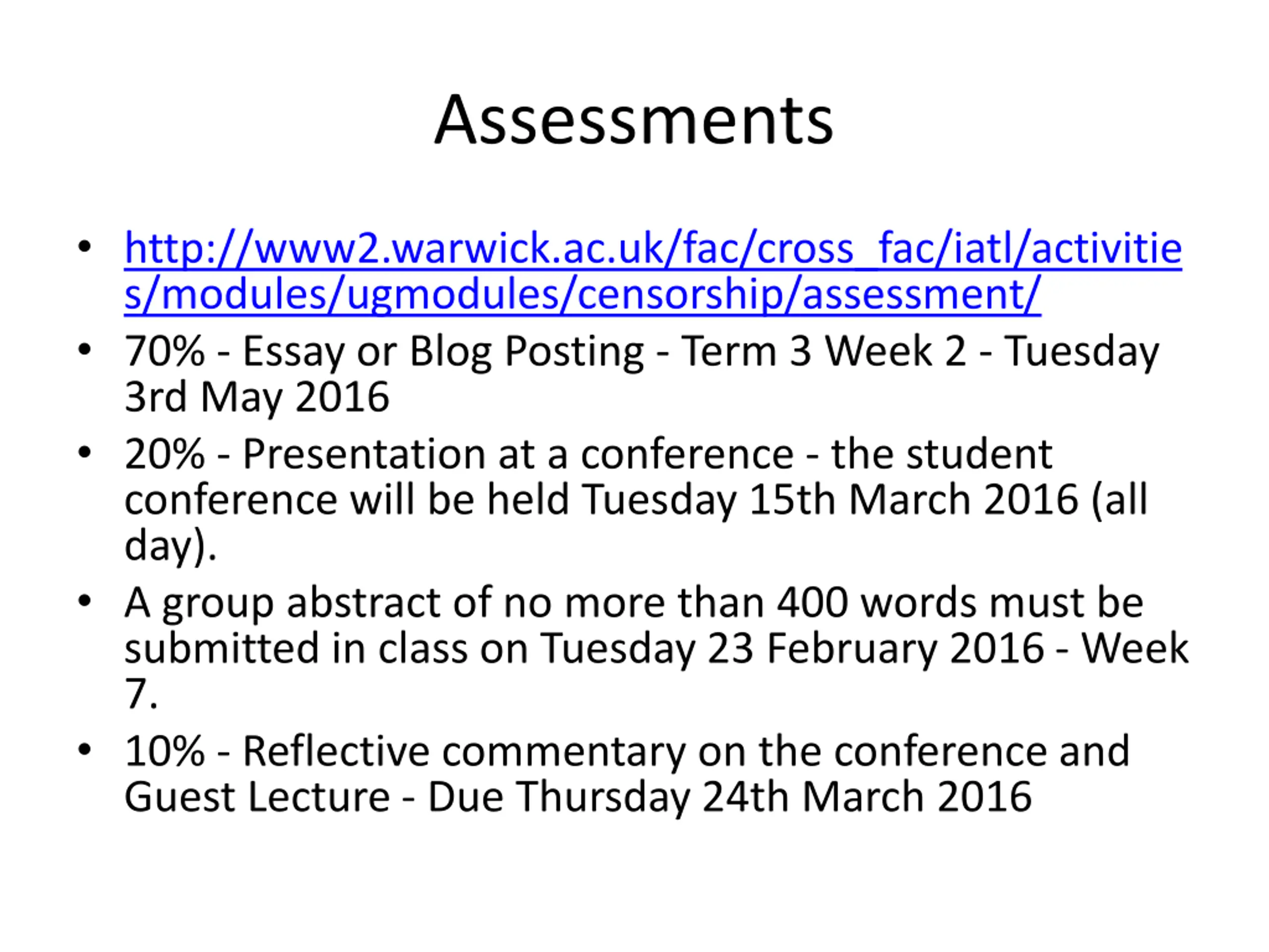 Assessments http://www2.warwick.ac.uk/fac/cross_fac/iatl/activitie s/modules/ugmodules/censorship/assessment/ 70% - Essay or Blog Posting - Term 3 Week 2 - Tuesday 3rd May 2016 20% - Presentation at a conference - the student conference will be held Tuesday 15th March 2016 (all day). A group abstract of no more than 400 words must be submitted in class on Tuesday 23 February 2016 - Week 7. 10% - Reflective commentary on the conference and Guest Lecture - Due Thursday 24th March 2016