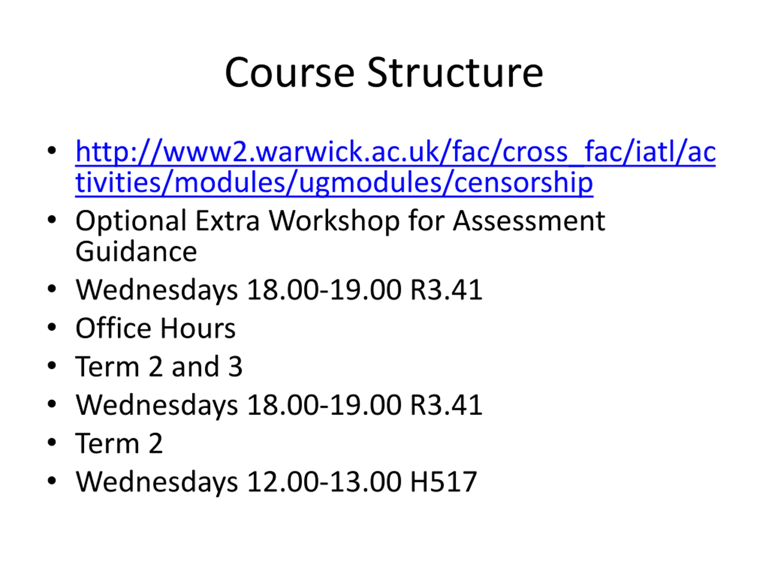 Course Structure http://www2.warwick.ac.uk/fac/cross_fac/iatl/ac tivities/modules/ugmodules/censorship Optional Extra Workshop for Assessment Guidance Wednesdays 18.00-19.00 R3.41 Office Hours Term 2 and 3 Wednesdays 18.00-19.00 R3.41 Term 2 Wednesdays 12.00-13.00 H517