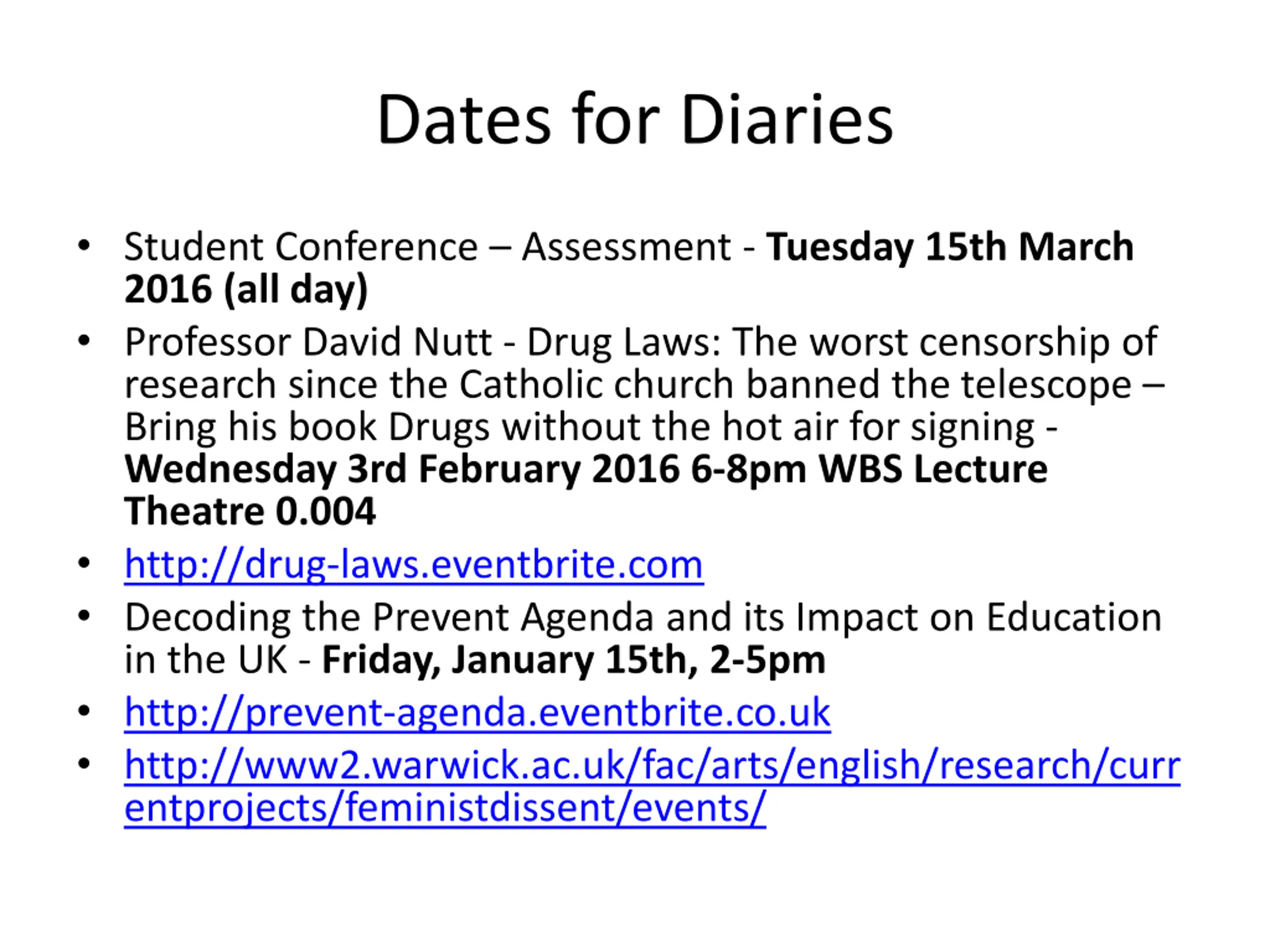 Dates for Diaries Student Conference Assessment - Tuesday 15th March 2016 (all day) Professor David Nutt - Drug Laws: The worst censorship of research since the Catholic church banned the telescope Bring his book Drugs without the hot air for signing - Wednesday 3rd February 2016 6-8pm WBS Lecture Theatre 0.004 http://drug-laws.eventbrite.com Decoding the Prevent Agenda and its Impact on Education in the UK - Friday, January 15th, 2-5pm http://prevent-agenda.eventbrite.co.uk http://www2.warwick.ac.uk/fac/arts/english/research/curr entprojects/feministdissent/events/