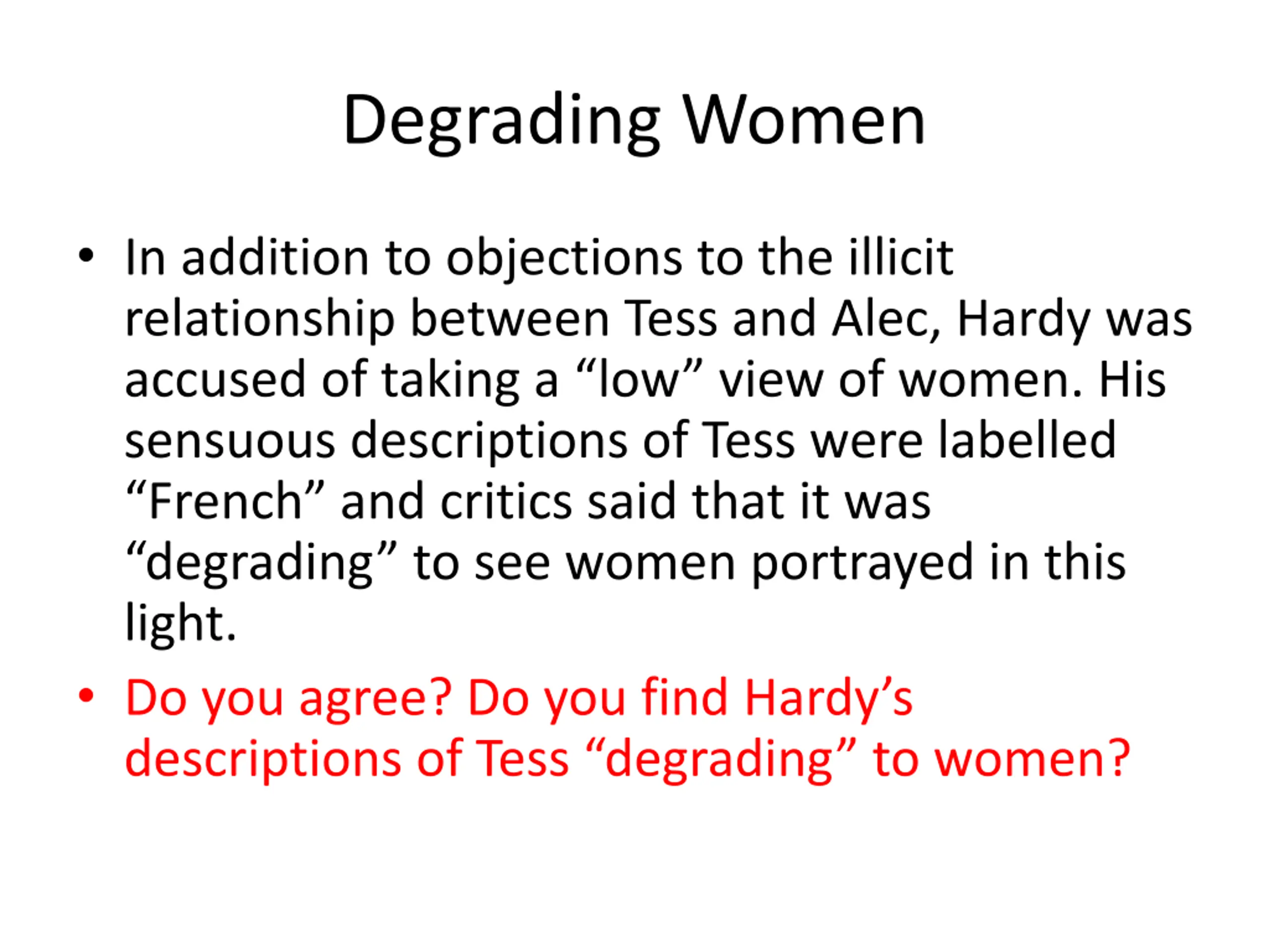 Degrading Women In addition to objections to the illicit relationship between Tess and Alec, Hardy was accused of taking a low view of women. His sensuous descriptions of Tess were labelled French and critics said that it was degrading to see women portrayed in this light. Do you agree? Do you find Hardy s descriptions of Tess degrading to women?