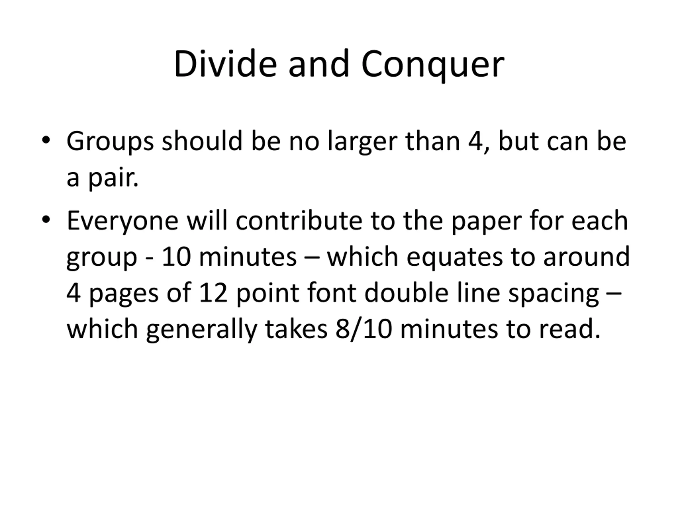 Divide and Conquer Groups should be no larger than 4, but can be a pair. Everyone will contribute to the paper for each group - 10 minutes which equates to around 4 pages of 12 point font double line spacing which generally takes 8/10 minutes to read.
