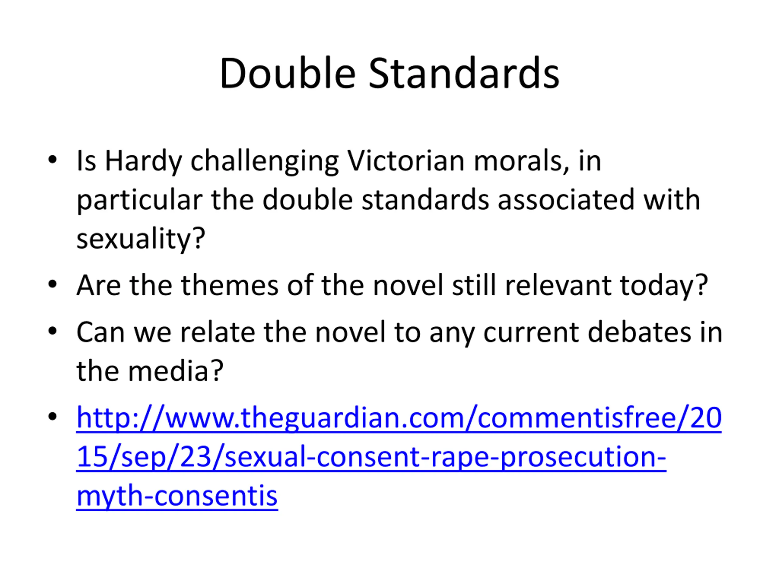 Double Standards Is Hardy challenging Victorian morals, in particular the double standards associated with sexuality? Are the themes of the novel still relevant today? Can we relate the novel to any current debates in the media? http://www.theguardian.com/commentisfree/20 15/sep/23/sexual-consent-rape-prosecution- myth-consentis