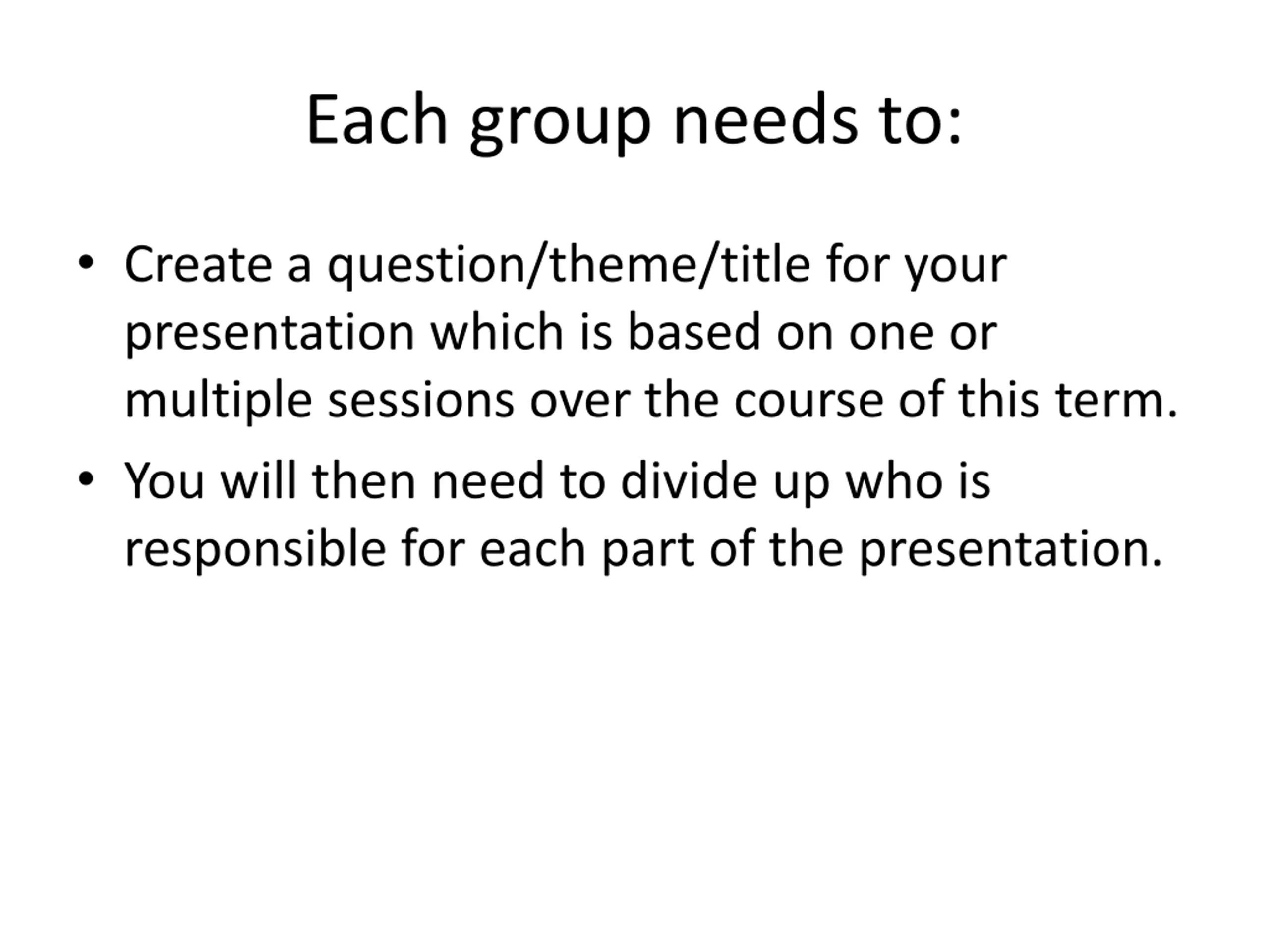 Each group needs to: Create a question/theme/title for your presentation which is based on one or multiple sessions over the course of this term. You will then need to divide up who is responsible for each part of the presentation.
