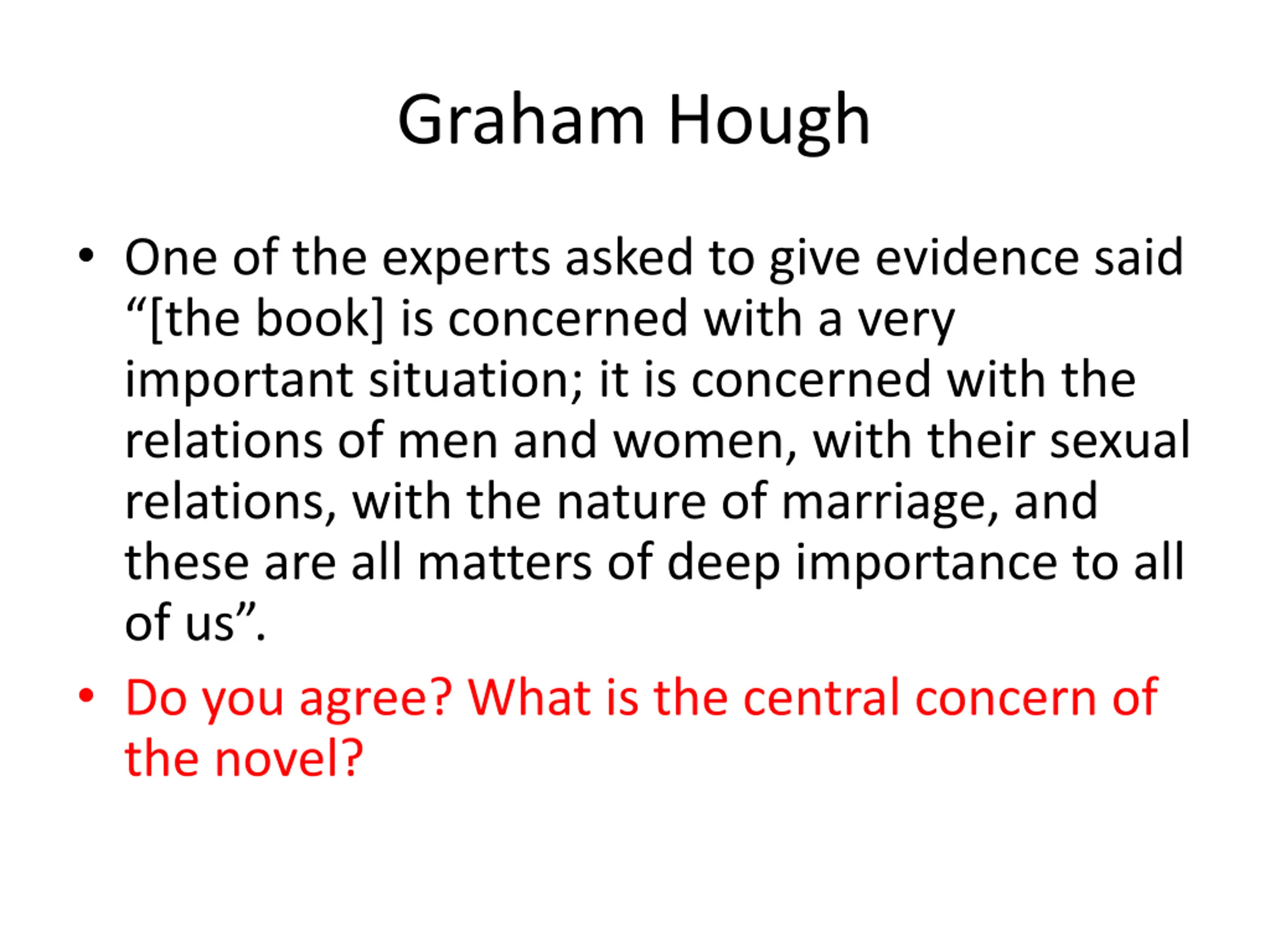 Graham Hough One of the experts asked to give evidence said [the book] is concerned with a very important situation; it is concerned with the relations of men and women, with their sexual relations, with the nature of marriage, and these are all matters of deep importance to all of us . Do you agree? What is the central concern of the novel?