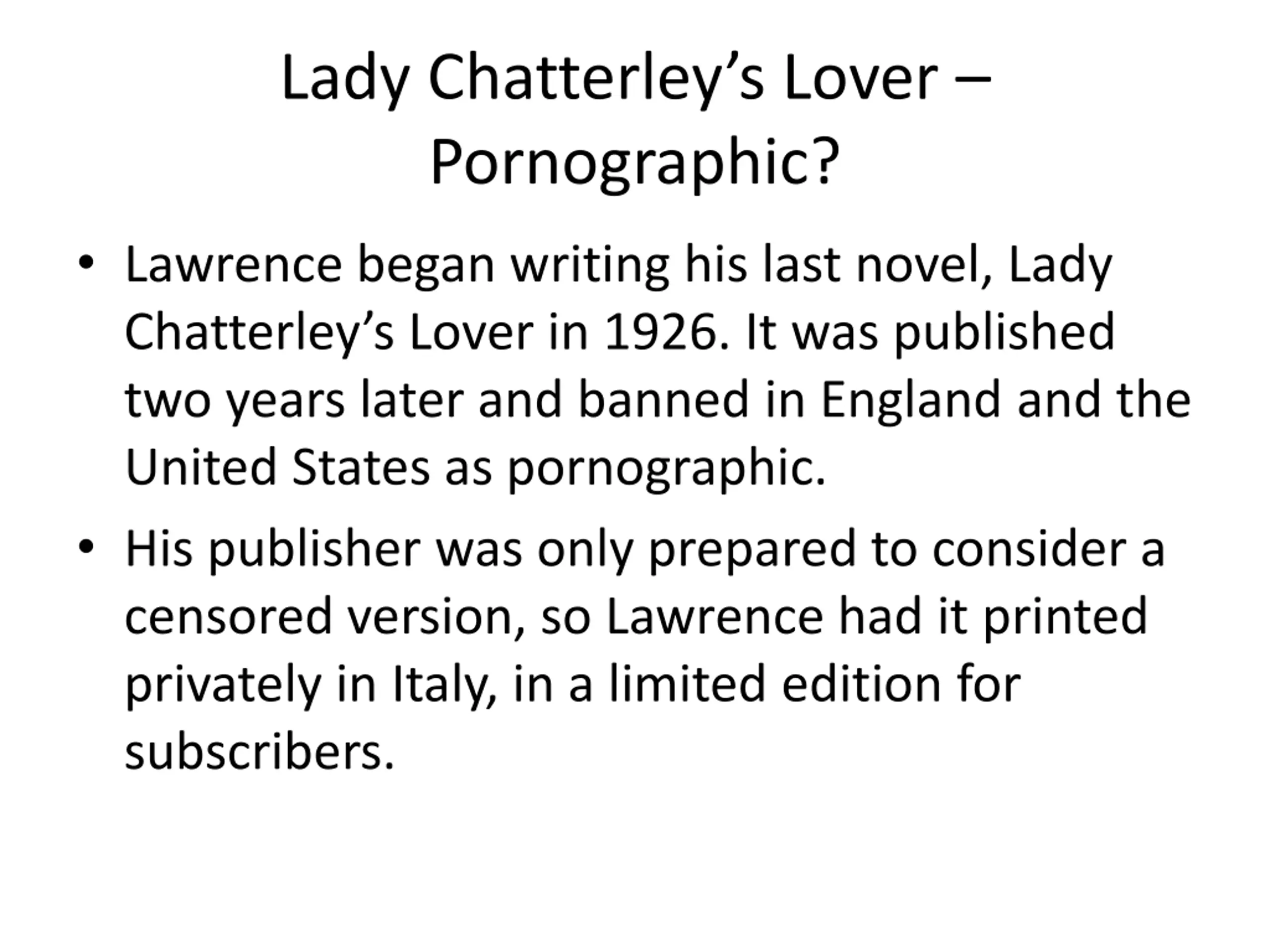 Lady Chatterleys Lover Pornographic? Lawrence began writing his last novel, Lady Chatterley s Lover in 1926. It was published two years later and banned in England and the United States as pornographic. His publisher was only prepared to consider a censored version, so Lawrence had it printed privately in Italy, in a limited edition for subscribers.