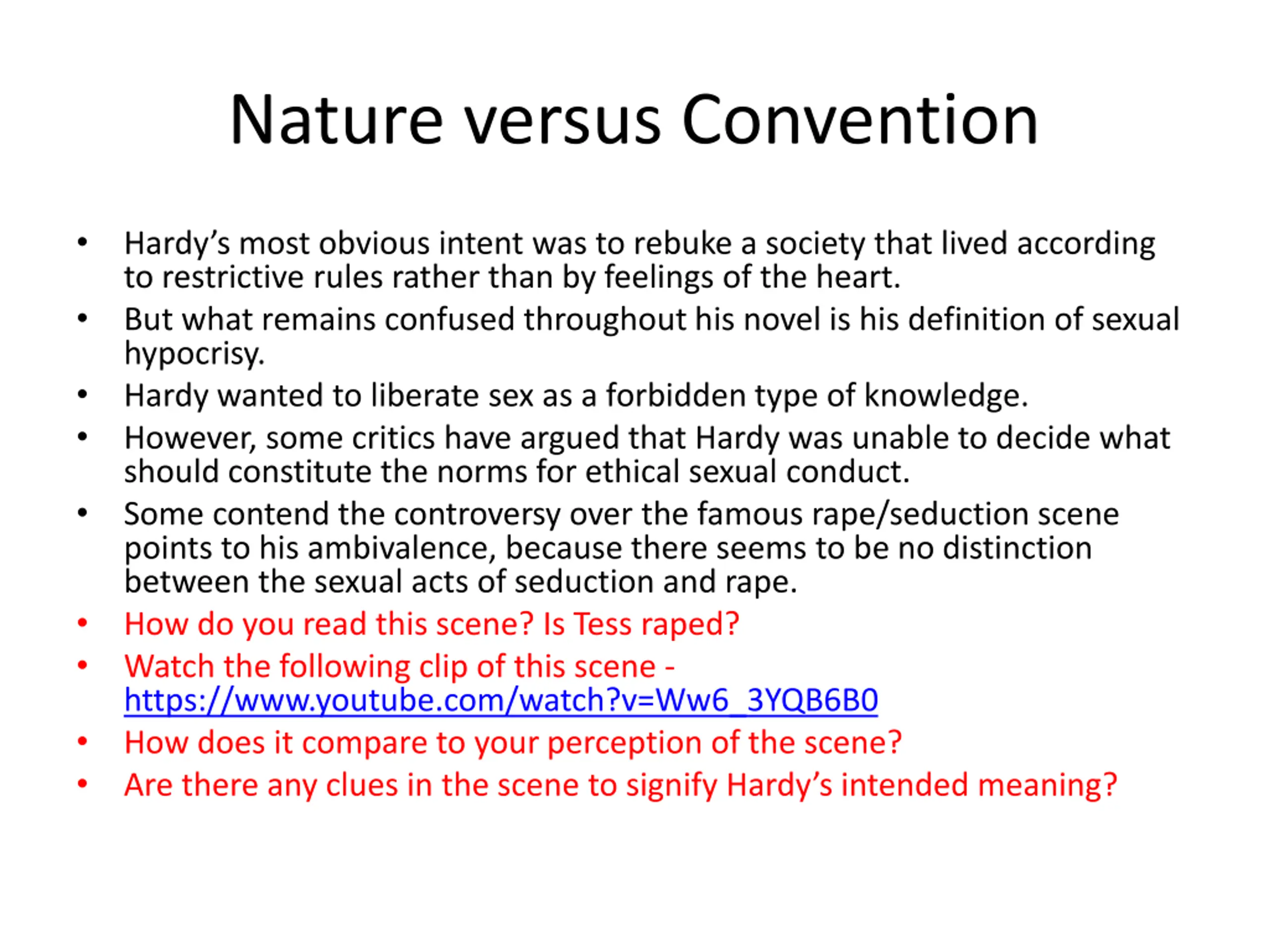 Nature versus Convention Hardy s most obvious intent was to rebuke a society that lived according to restrictive rules rather than by feelings of the heart. But what remains confused throughout his novel is his definition of sexual hypocrisy. Hardy wanted to liberate sex as a forbidden type of knowledge. However, some critics have argued that Hardy was unable to decide what should constitute the norms for ethical sexual conduct. Some contend the controversy over the famous rape/seduction scene points to his ambivalence, because there seems to be no distinction between the sexual acts of seduction and rape. How do you read this scene? Is Tess raped? Watch the following clip of this scene - https://www.youtube.com/watch?v=Ww6_3YQB6B0 How does it compare to your perception of the scene? Are there any clues in the scene to signify Hardy s intended meaning?