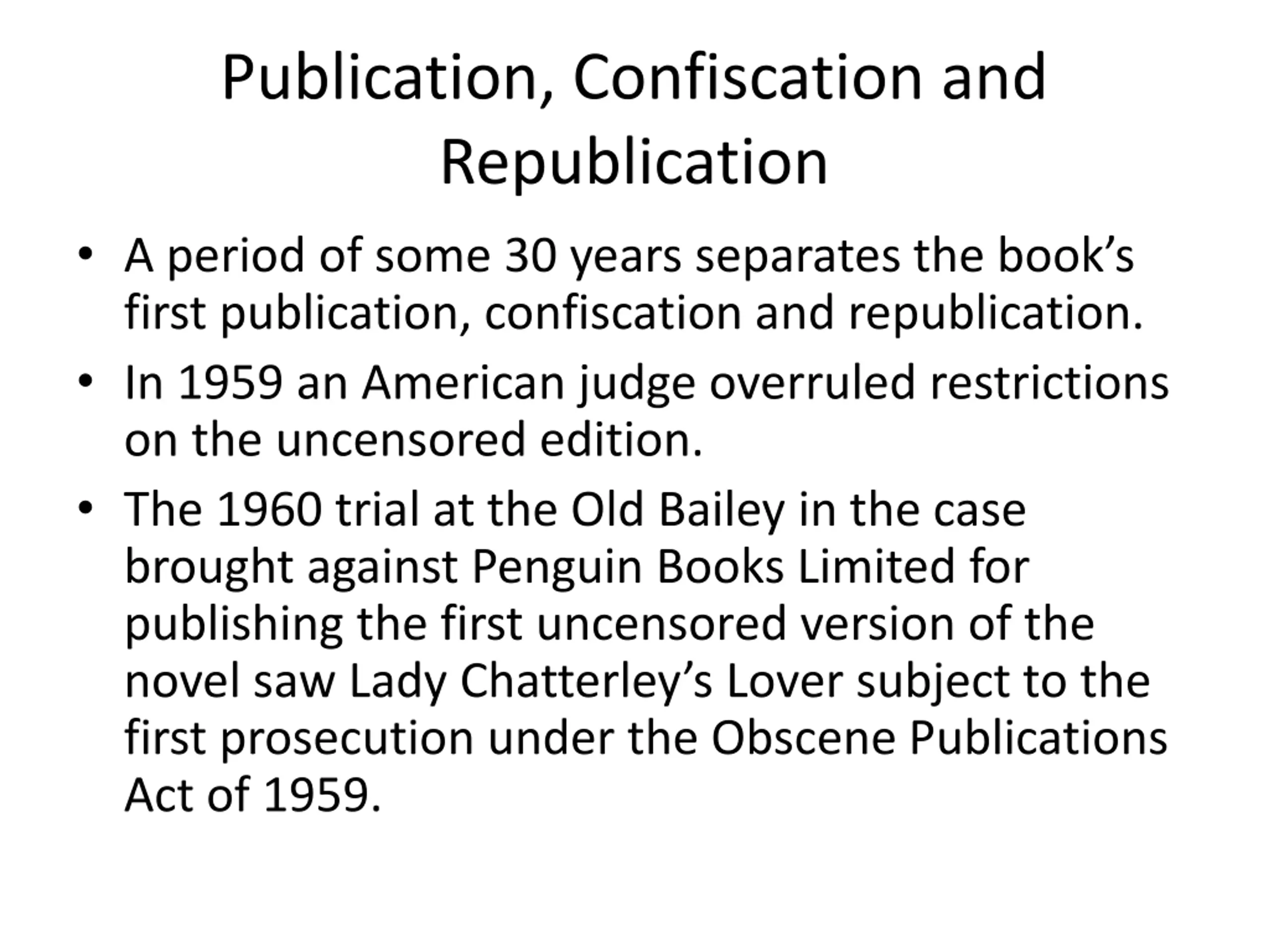 Publication, Confiscation and Republication A period of some 30 years separates the book s first publication, confiscation and republication. In 1959 an American judge overruled restrictions on the uncensored edition. The 1960 trial at the Old Bailey in the case brought against Penguin Books Limited for publishing the first uncensored version of the novel saw Lady Chatterley s Lover subject to the first prosecution under the Obscene Publications Act of 1959.