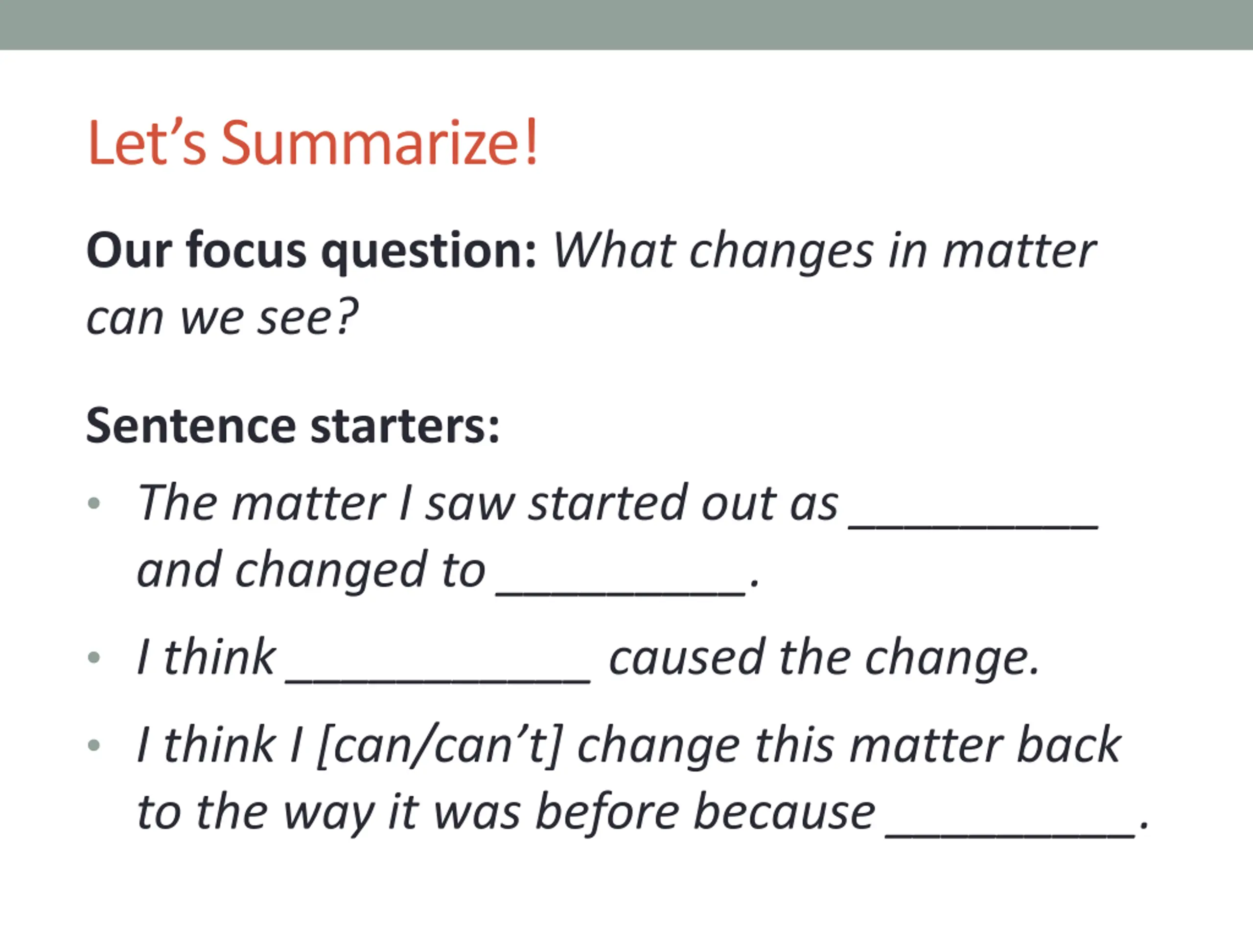 Lets Summarize! Our focus question: What changes in matter can we see? Sentence starters: The matter I saw started out as _________ and changed to _________. I think ___________ caused the change. I think I [can/can t] change this matter back to the way it was before because _________.