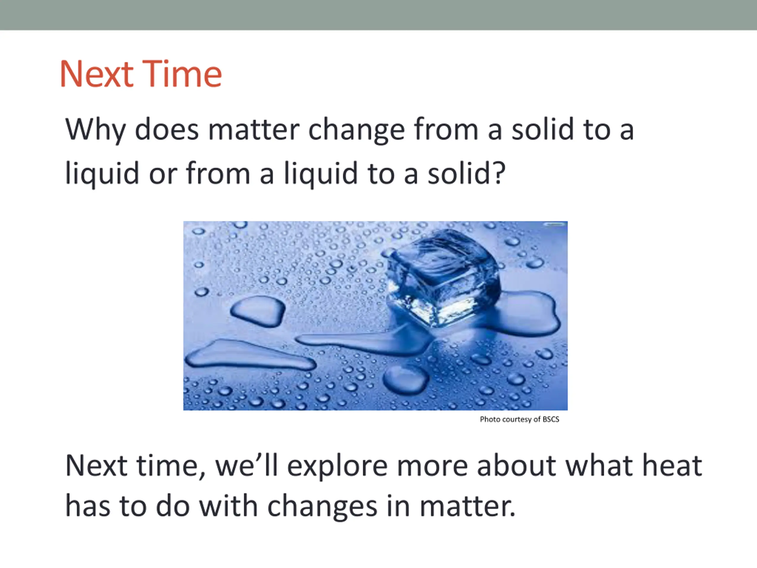 Next Time Why does matter change from a solid to a liquid or from a liquid to a solid? Photo courtesy of BSCS Next time, we ll explore more about what heat has to do with changes in matter.