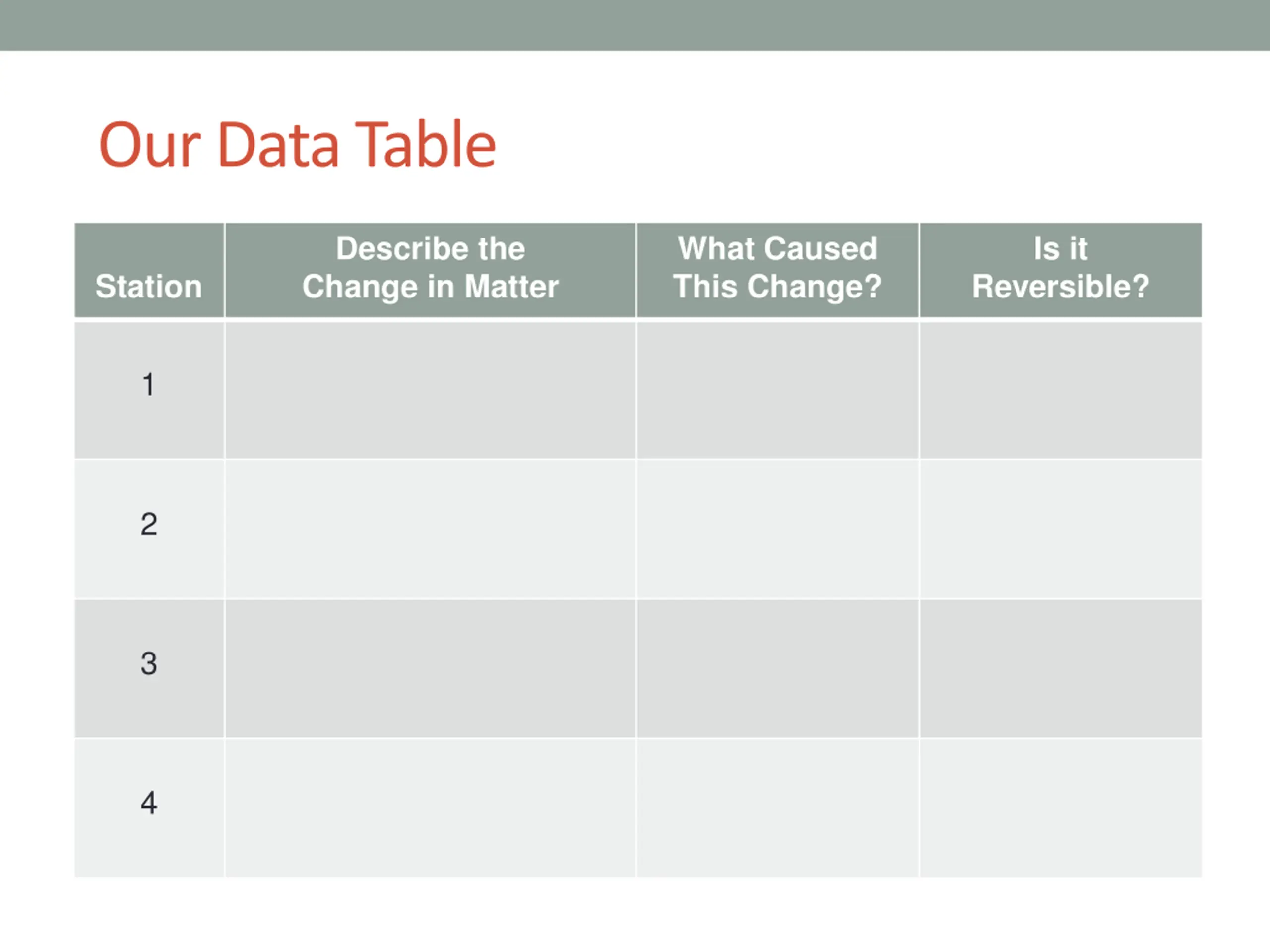 Our Data Table Describe the Change in Matter What Caused This Change? Is it Station Reversible? 1 2 3 4