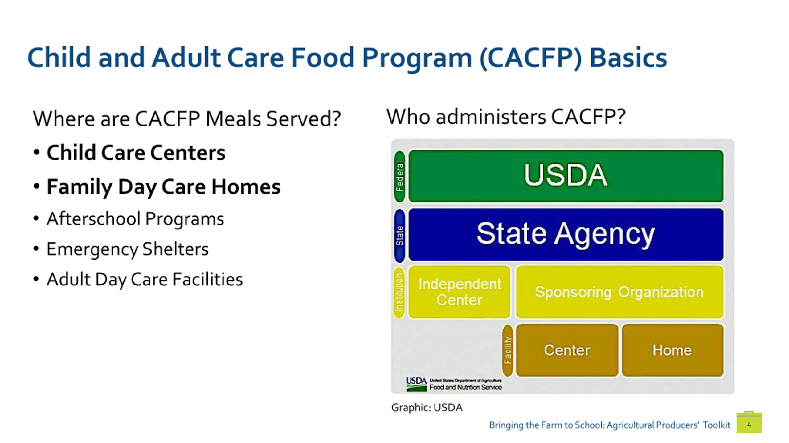 Child and Adult Care Food Program (CACFP) Basics Who administers CACFP? Where are CACFP Meals Served? Child Care Centers Family Day Care Homes Afterschool Programs Emergency Shelters Adult Day Care Facilities Graphic: USDA 4 Bringing the Farm to School: Agricultural Producers Toolkit