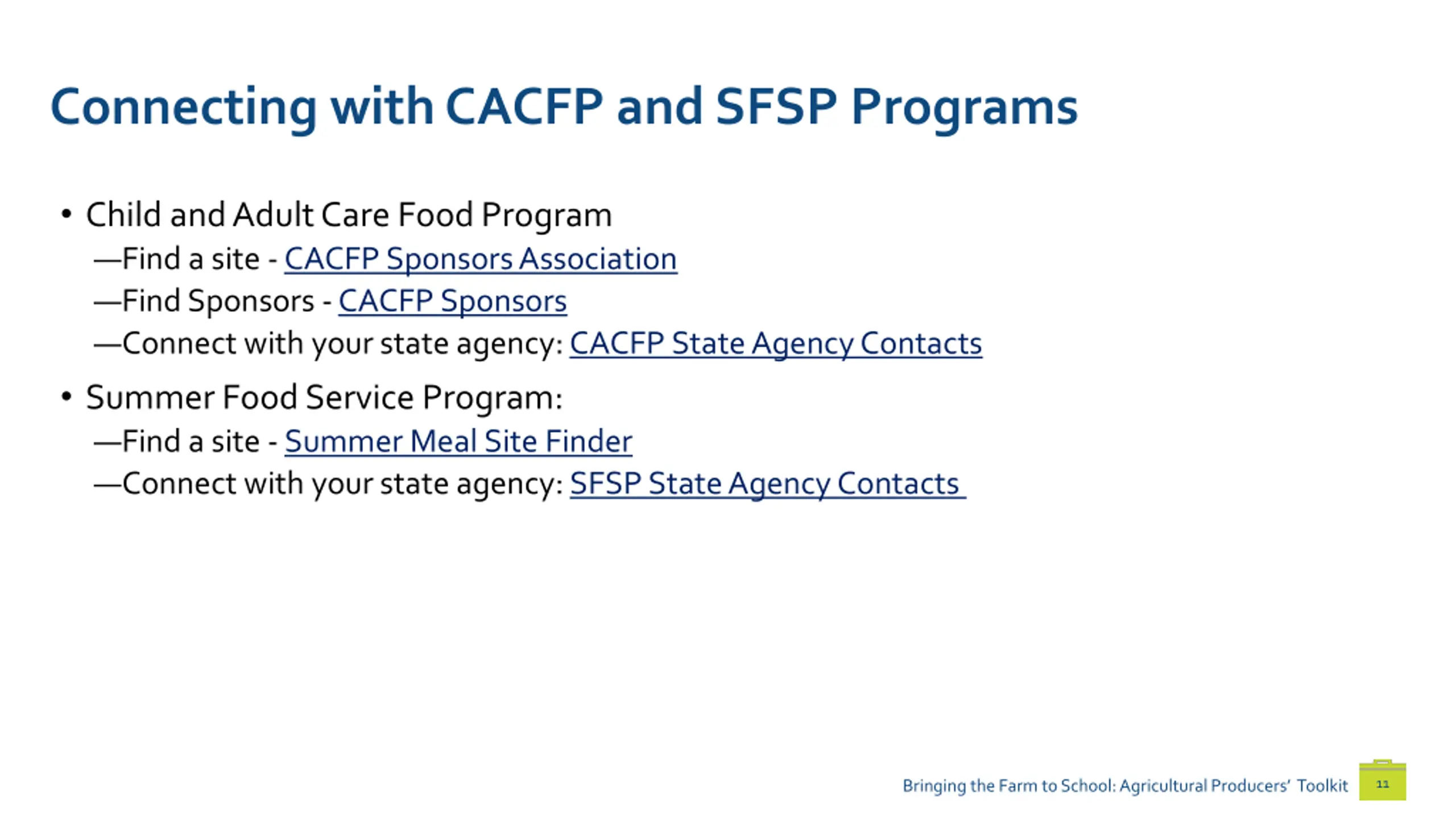 Connecting with CACFP and SFSP Programs Child and Adult Care Food Program Find a site - CACFP Sponsors Association Find Sponsors - CACFP Sponsors Connect with your state agency: CACFP State Agency Contacts Summer Food Service Program: Find a site - Summer Meal Site Finder Connect with your state agency: SFSP State Agency Contacts 11 Bringing the Farm to School: Agricultural Producers Toolkit