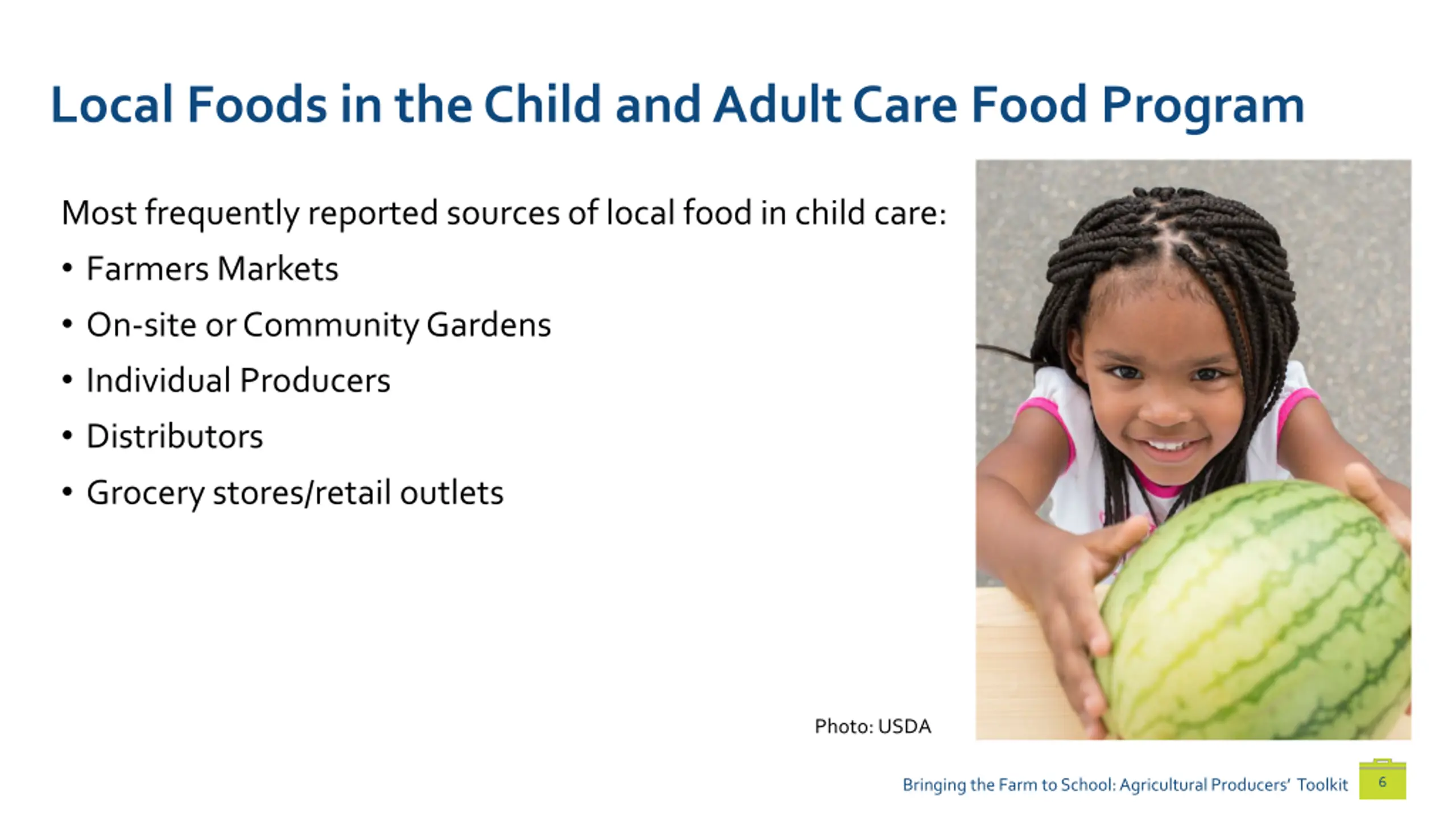 Local Foods in the Child and Adult Care Food Program Most frequently reported sources of local food in child care: Farmers Markets On-site or Community Gardens Individual Producers Distributors Grocery stores/retail outlets Photo: USDA 6 Bringing the Farm to School: Agricultural Producers Toolkit