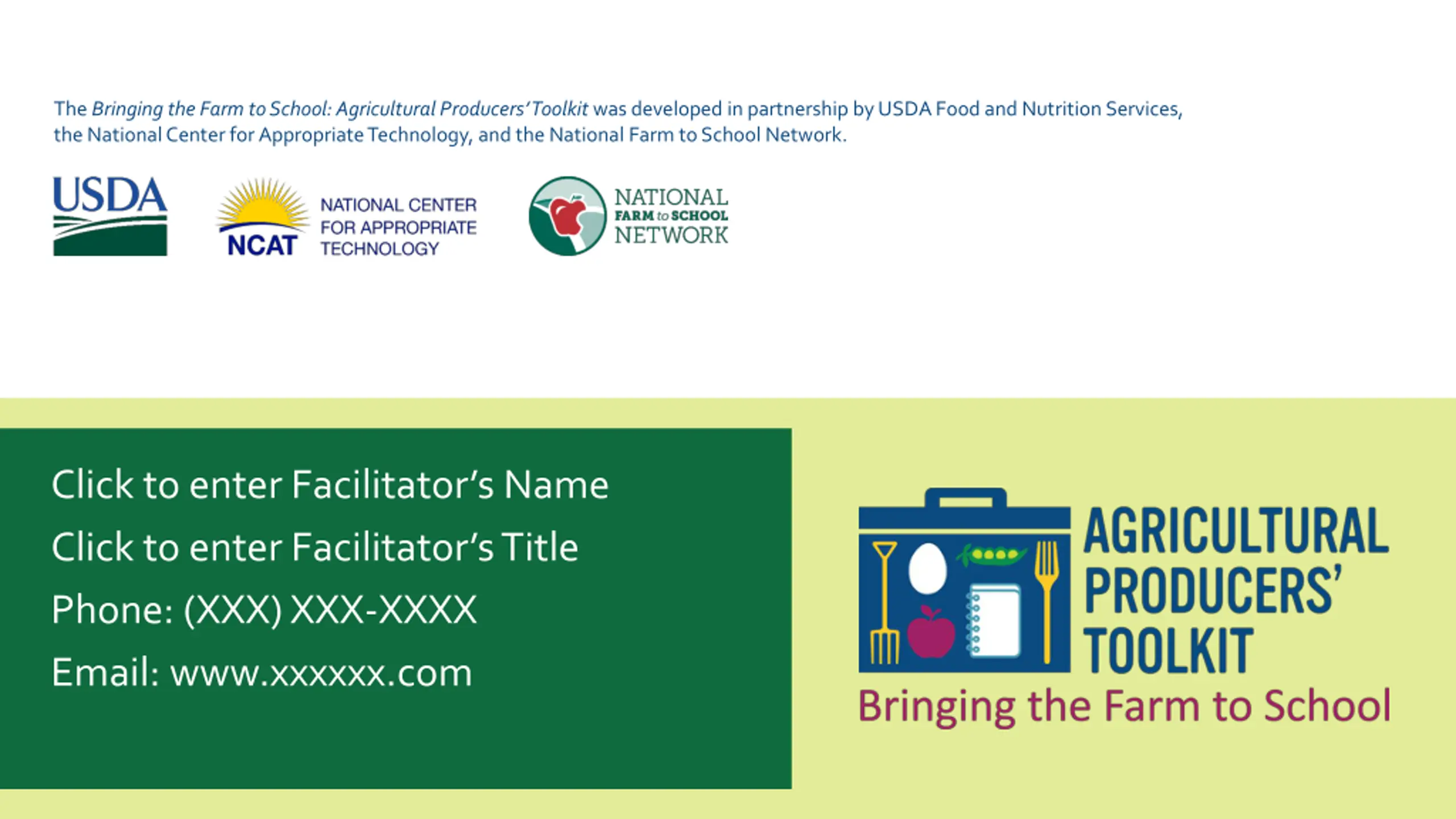 The Bringing the Farm to School: Agricultural Producers Toolkit was developed in partnership by USDA Food and Nutrition Services, the National Center for Appropriate Technology, and the National Farm to School Network. Click to enter Facilitator s Name Click to enter Facilitator s Title Phone: (XXX) XXX-XXXX Email: www.xxxxxx.com