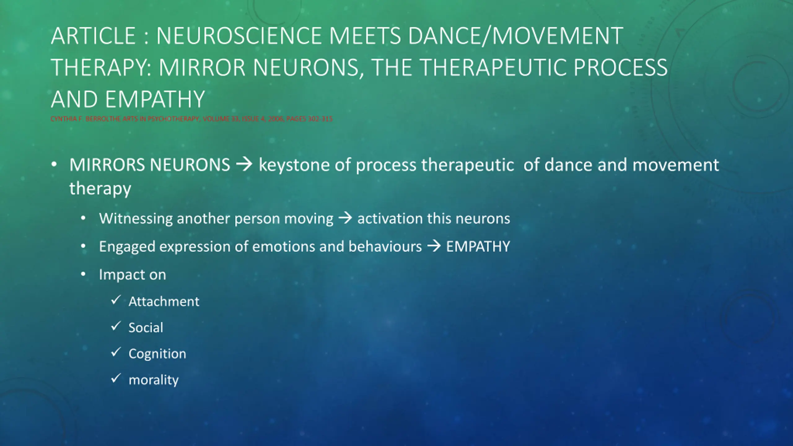 ARTICLE : NEUROSCIENCE MEETS DANCE/MOVEMENT THERAPY: MIRROR NEURONS, THE THERAPEUTIC PROCESS AND EMPATHY CYNTHIA F. BERROLTHE ARTS IN PSYCHOTHERAPY, VOLUME 33, ISSUE 4, 2006, PAGES 302-315 MIRRORS NEURONS keystone of process therapeutic of dance and movement therapy Witnessing another person moving activation this neurons Engaged expression of emotions and behaviours EMPATHY Impact on Attachment Social Cognition morality