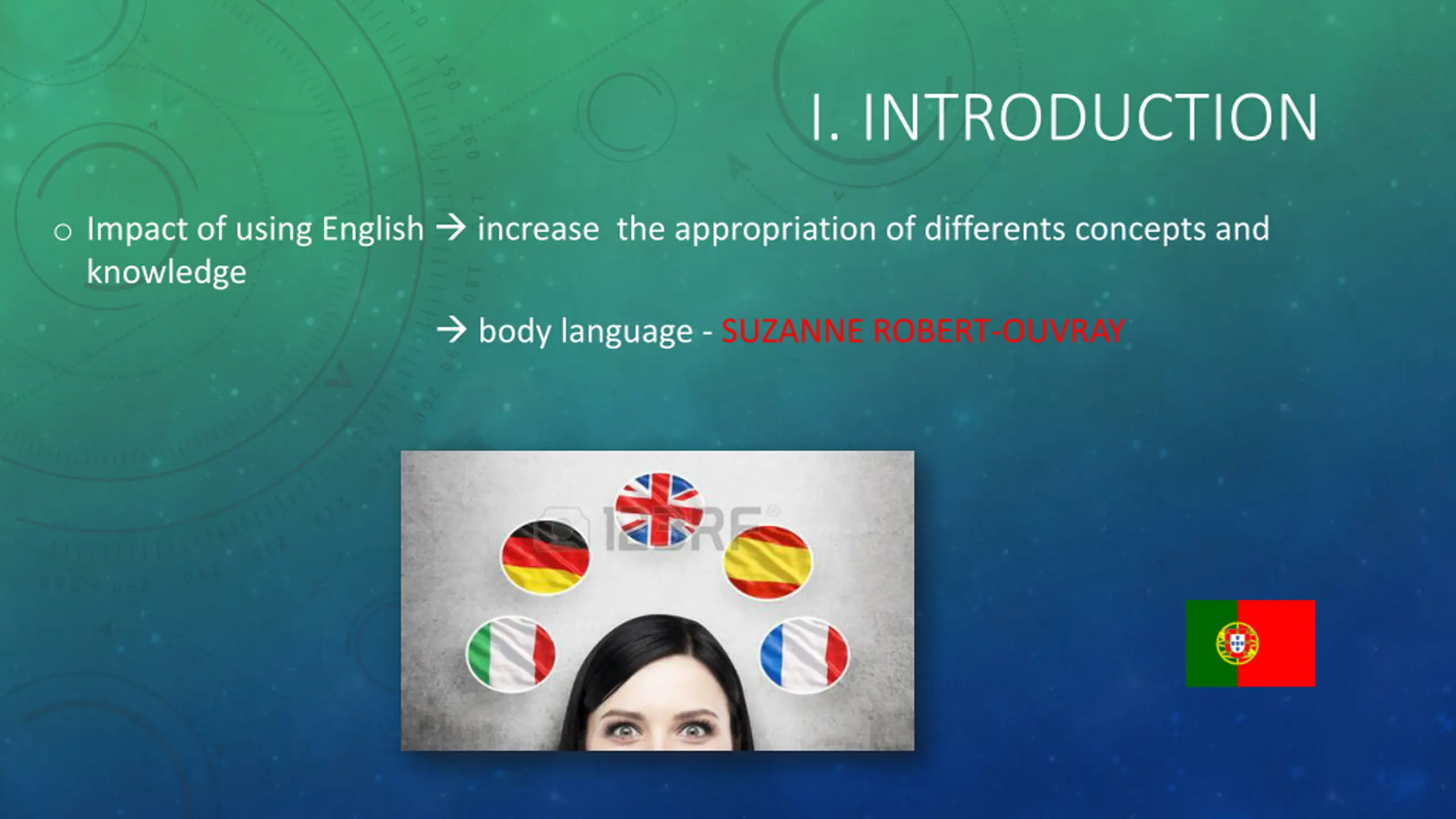 I. INTRODUCTION o Impact of using English increase the appropriation of differents concepts and knowledge body language - SUZANNE ROBERT-OUVRAY