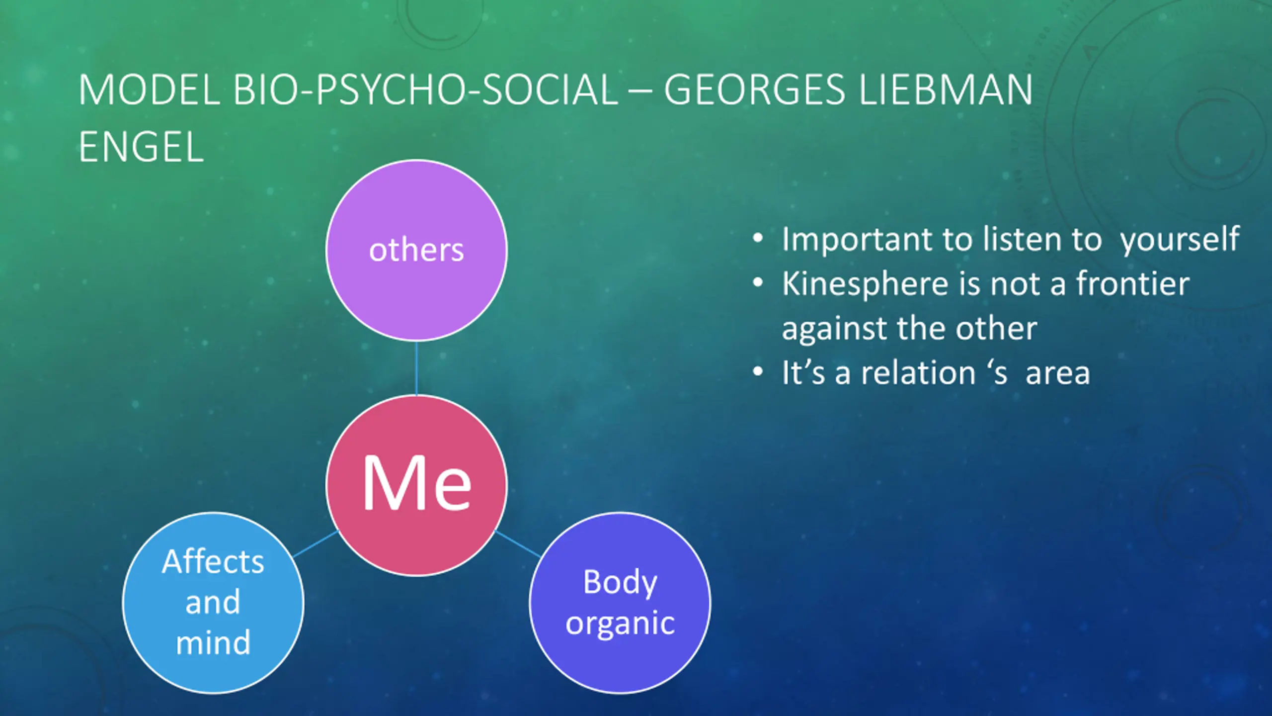 MODEL BIO-PSYCHO-SOCIAL GEORGES LIEBMAN ENGEL Important to listen to yourself Kinesphere is not a frontier against the other It s a relation s area others Me Affects and mind Body organic