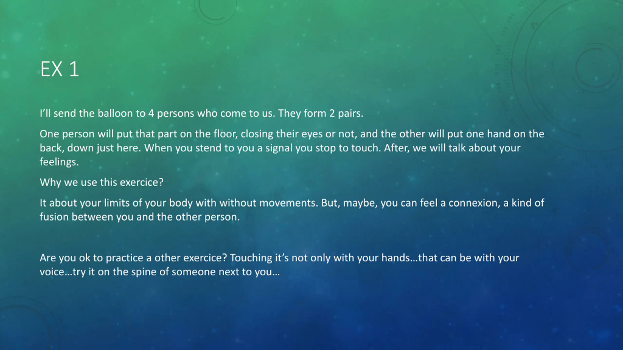 EX 1 I ll send the balloon to 4 persons who come to us. They form 2 pairs. One person will put that part on the floor, closing their eyes or not, and the other will put one hand on the back, down just here. When you stend to you a signal you stop to touch. After, we will talk about your feelings. Why we use this exercice? It about your limits of your body with without movements. But, maybe, you can feel a connexion, a kind of fusion between you and the other person. Are you ok to practice a other exercice? Touching it s not only with your hands that can be with your voice try it on the spine of someone next to you