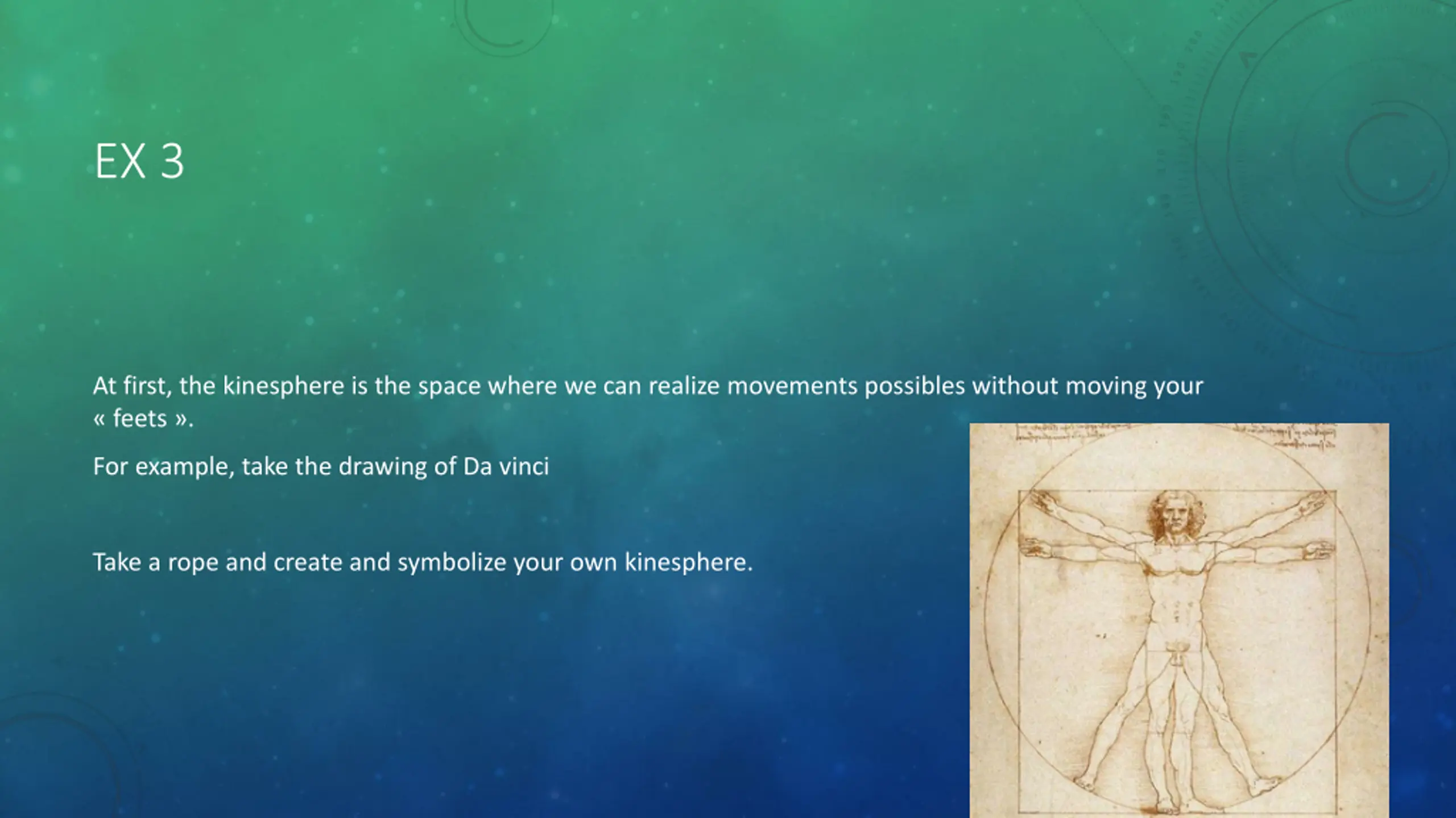EX 3 At first, the kinesphere is the space where we can realize movements possibles without moving your feets . For example, take the drawing of Da vinci Take a rope and create and symbolize your own kinesphere.