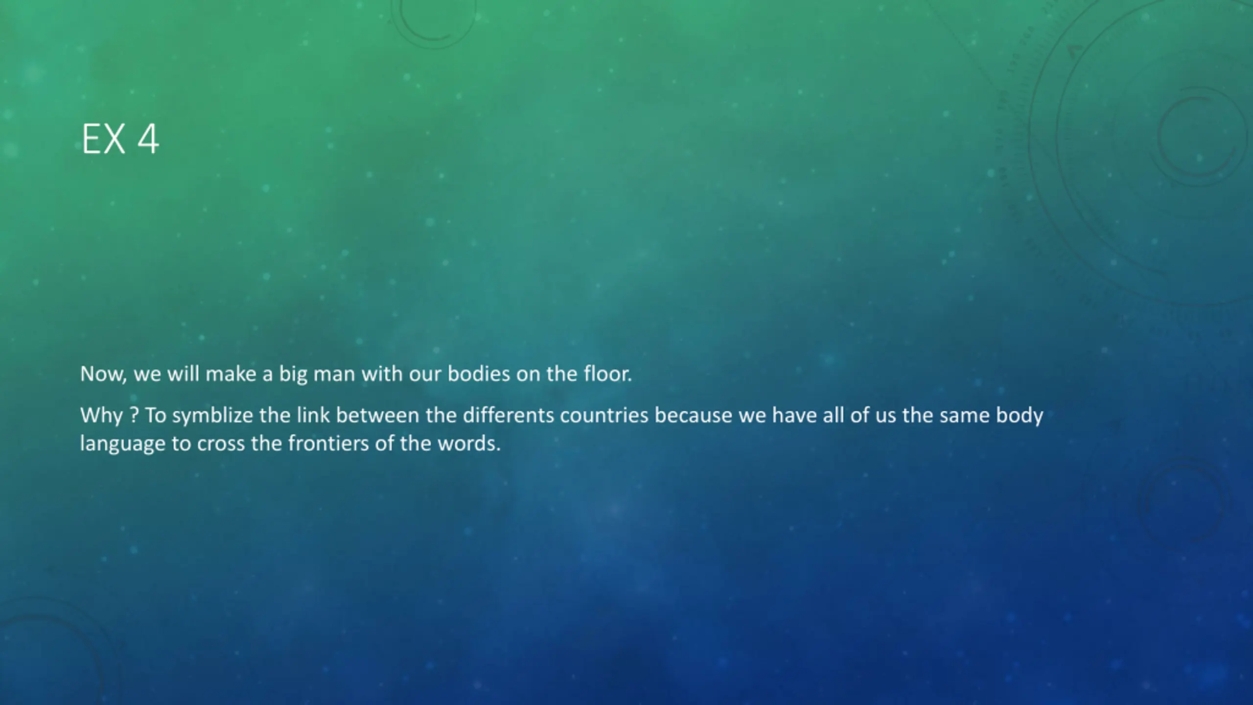 EX 4 Now, we will make a big man with our bodies on the floor. Why ? To symblize the link between the differents countries because we have all of us the same body language to cross the frontiers of the words.