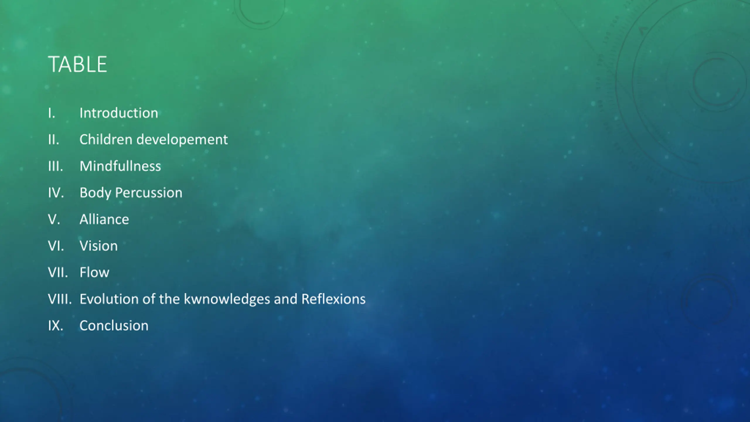 TABLE I. Introduction II. Children developement III. Mindfullness IV. Body Percussion V. Alliance VI. Vision VII. Flow VIII. Evolution of the kwnowledges and Reflexions IX. Conclusion