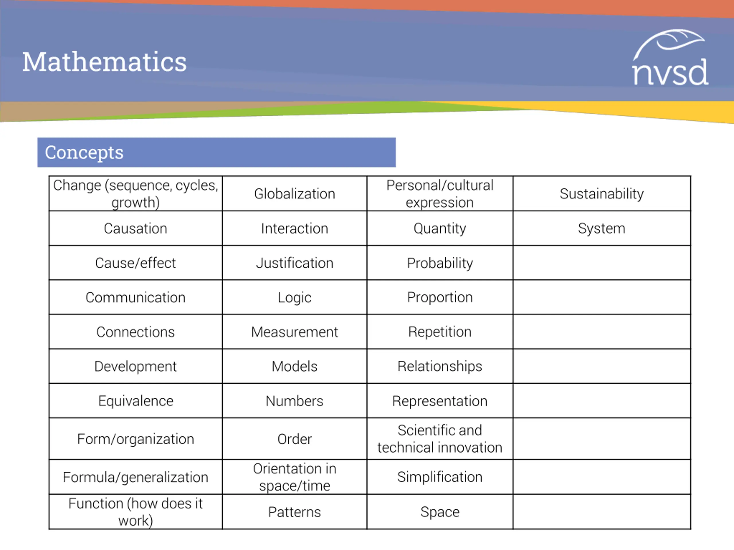 Mathematics Concepts Change (sequence, cycles, growth) Personal/cultural expression Quantity Globalization Sustainability System Causation Interaction Cause/effect Justification Probability Proportion Communication Logic Repetition Connections Measurement Relationships Development Models Equivalence Numbers Representation Scientific and technical innovation Form/organization Order Orientation in space/time Simplification Formula/generalization Function (how does it work) Space Patterns