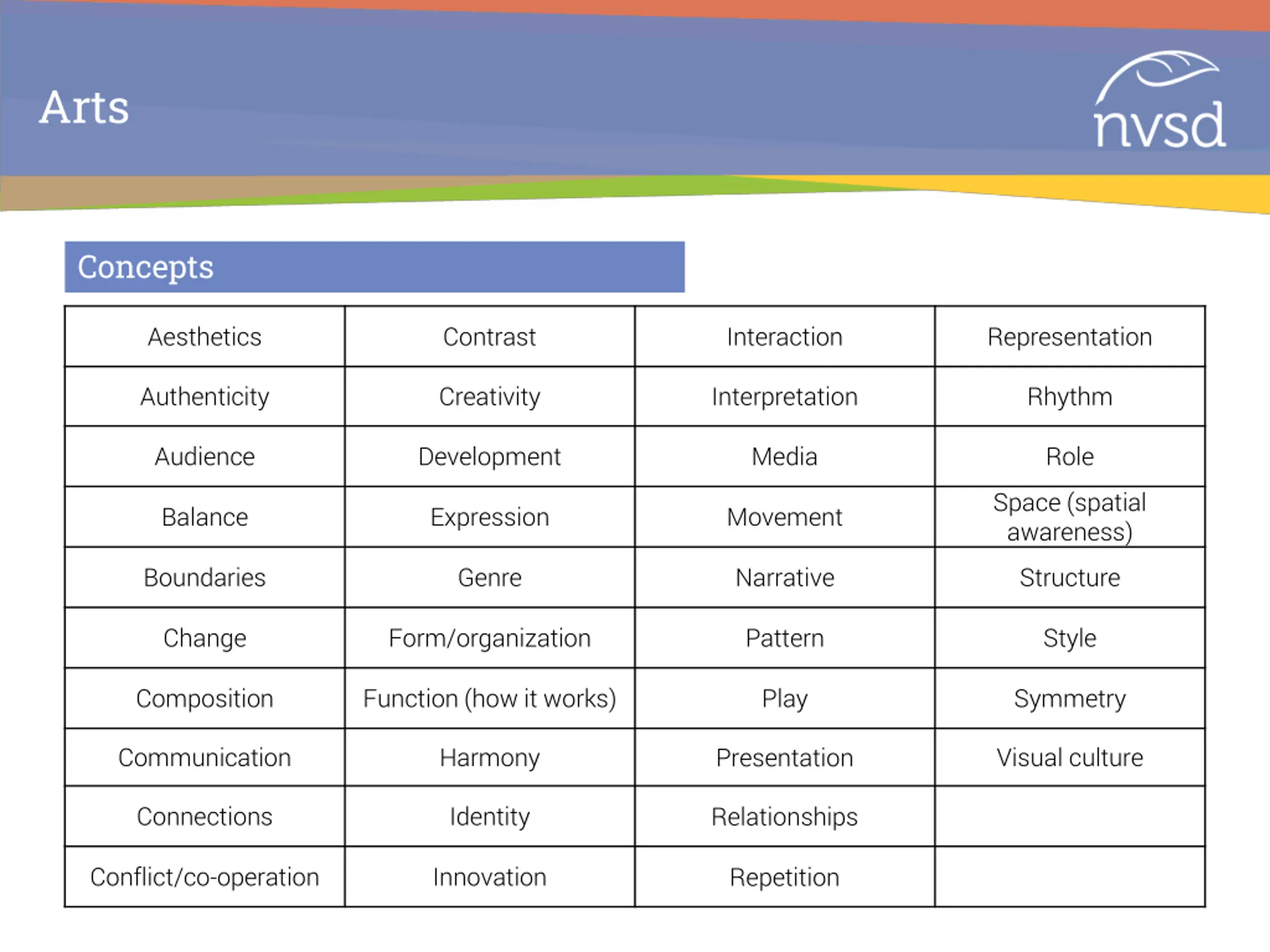 Arts Concepts Aesthetics Contrast Interaction Representation Authenticity Creativity Interpretation Rhythm Audience Development Media Role Space (spatial awareness) Balance Expression Movement Boundaries Genre Narrative Structure Change Form/organization Pattern Style Composition Function (how it works) Play Symmetry Communication Harmony Visual culture Presentation Connections Identity Relationships Conflict/co-operation Innovation Repetition