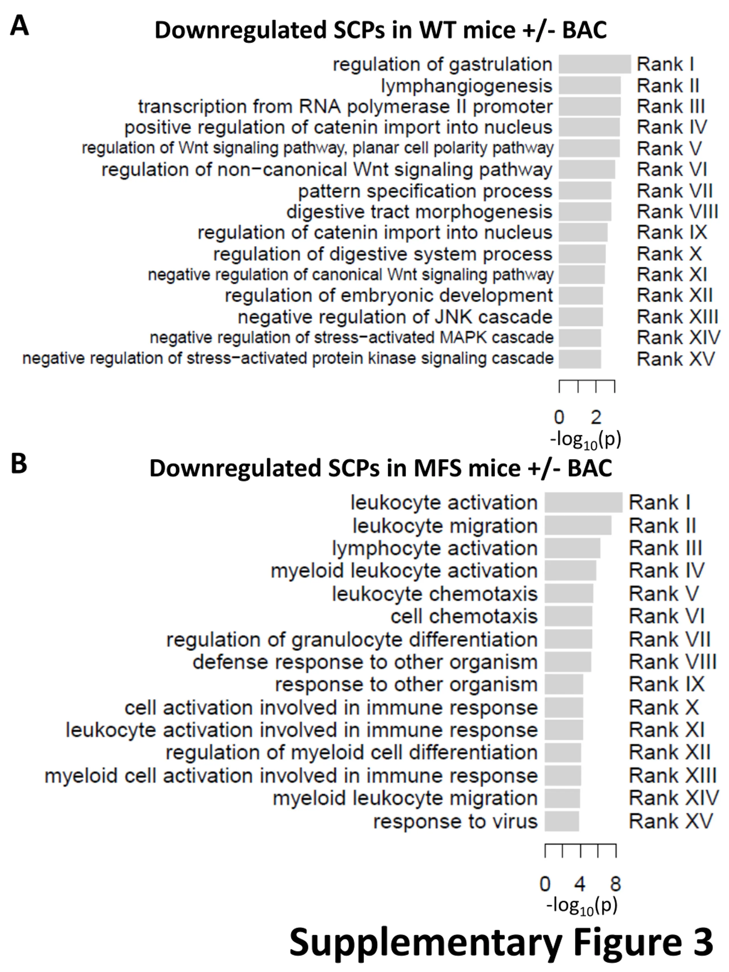A Downregulated SCPs in WT mice +/- BAC -log10(p) B Downregulated SCPs in MFS mice +/- BAC -log10(p) Supplementary Figure 3