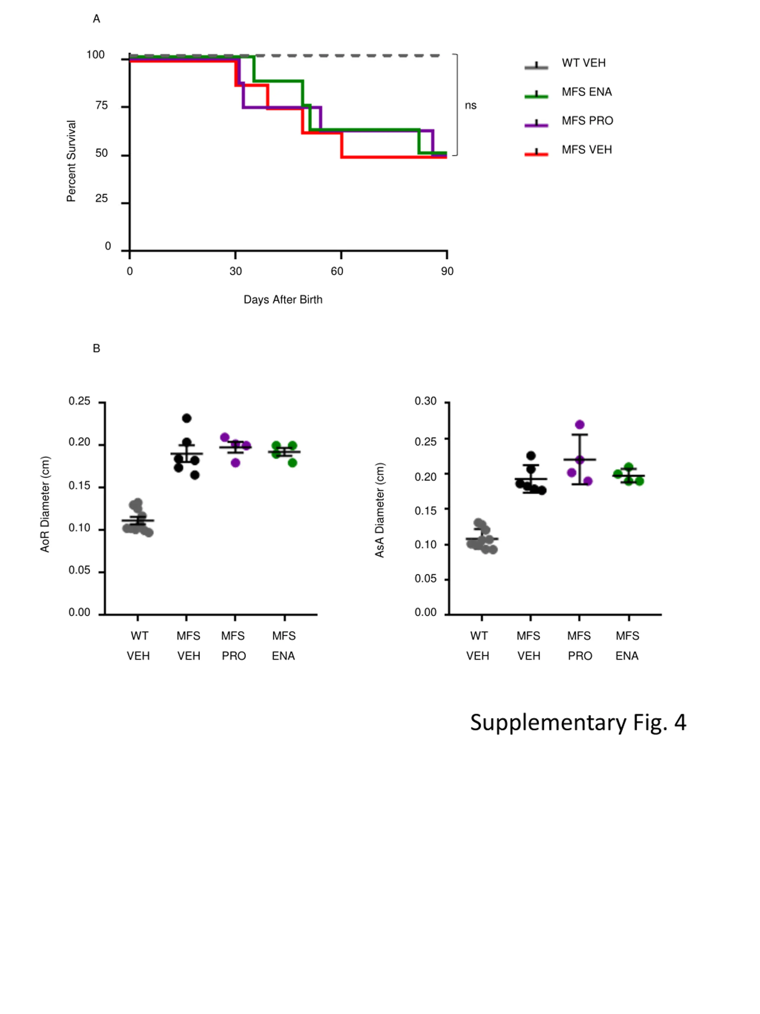 A 100 WT VEH MFS ENA ns 75 MFS PRO Percent Survival MFS VEH 50 25 0 0 30 60 90 Days After Birth B 0.25 0.30 0.20 0.25 AoR Diameter (cm) AsA Diameter (cm) 0.20 0.15 0.15 0.10 0.10 0.05 0.05 0.00 0.00 WT MFS MFS MFS WT MFS MFS MFS VEH VEH PRO ENA VEH VEH PRO ENA Supplementary Fig. 4