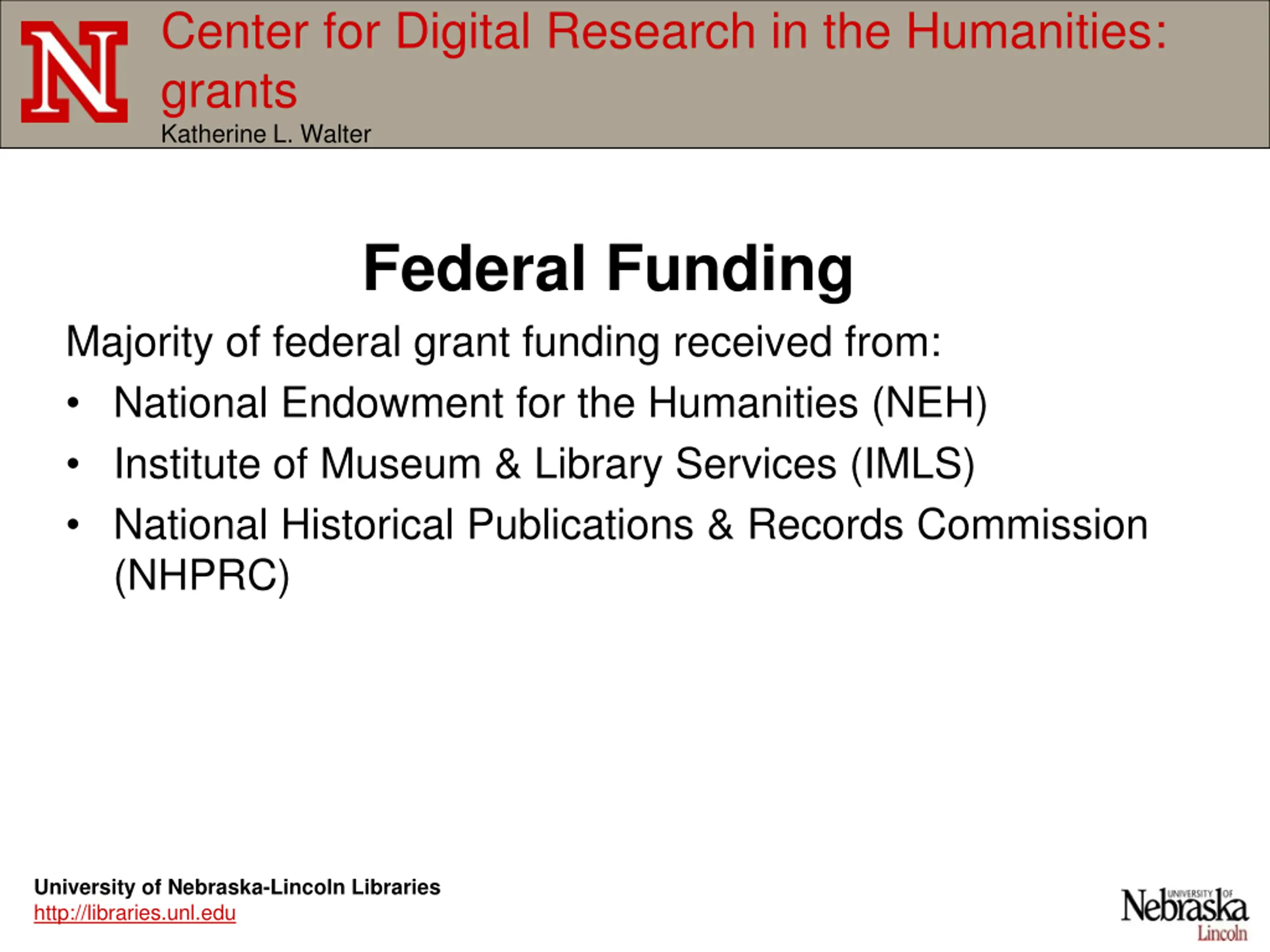 Center for Digital Research in the Humanities: grants Katherine L. Walter Federal Funding Majority of federal grant funding received from: National Endowment for the Humanities (NEH) Institute of Museum & Library Services (IMLS) National Historical Publications & Records Commission (NHPRC) University of Nebraska-Lincoln Libraries http://libraries.unl.edu