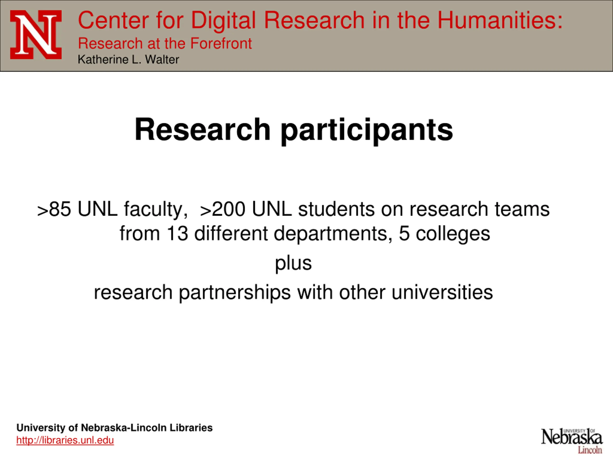 Center for Digital Research in the Humanities: Research at the Forefront Katherine L. Walter Research participants >85 UNL faculty, >200 UNL students on research teams from 13 different departments, 5 colleges plus research partnerships with other universities University of Nebraska-Lincoln Libraries http://libraries.unl.edu
