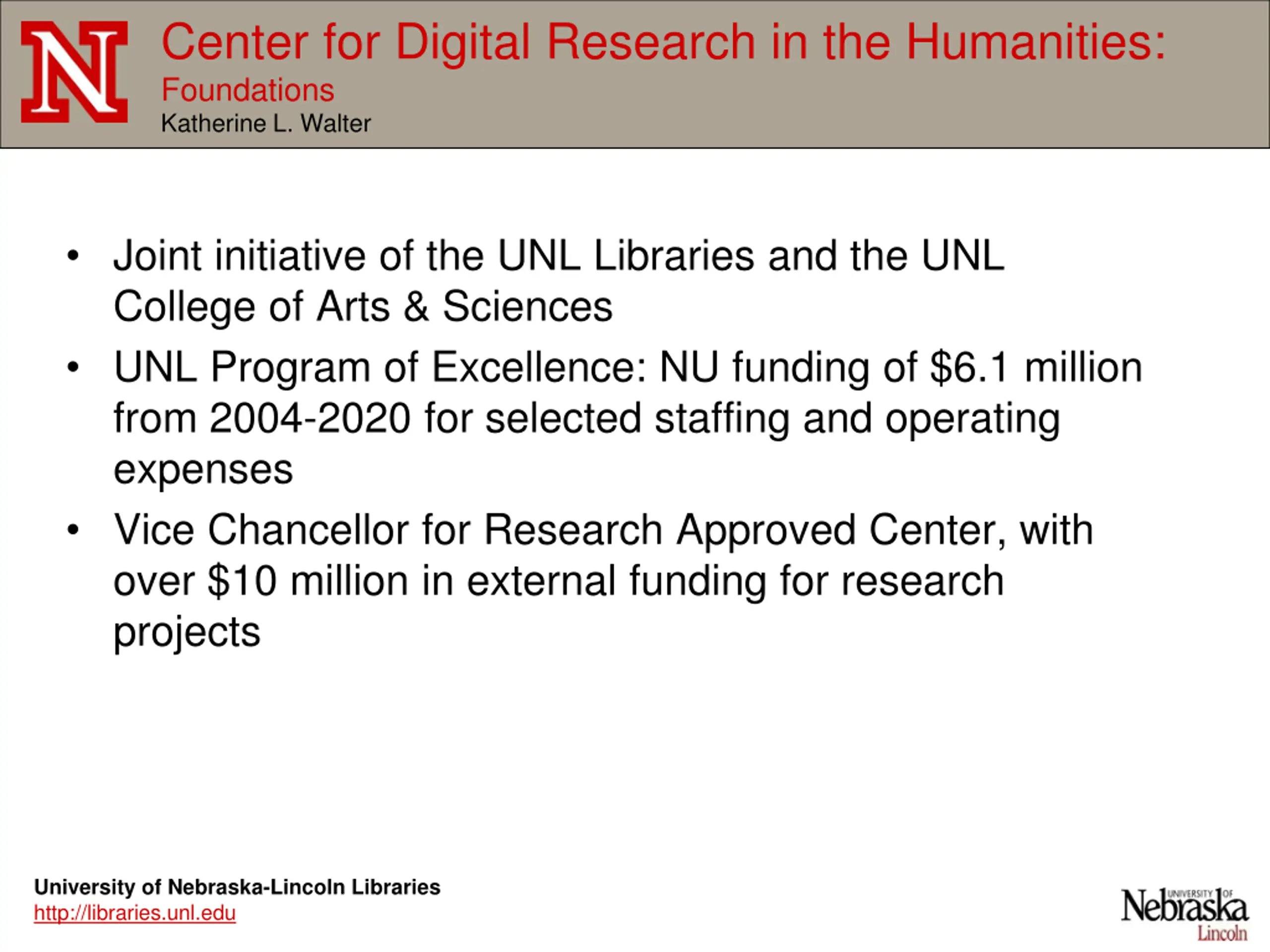 Center for Digital Research in the Humanities: Foundations Katherine L. Walter Joint initiative of the UNL Libraries and the UNL College of Arts & Sciences UNL Program of Excellence: NU funding of $6.1 million from 2004-2020 for selected staffing and operating expenses Vice Chancellor for Research Approved Center, with over $10 million in external funding for research projects University of Nebraska-Lincoln Libraries http://libraries.unl.edu